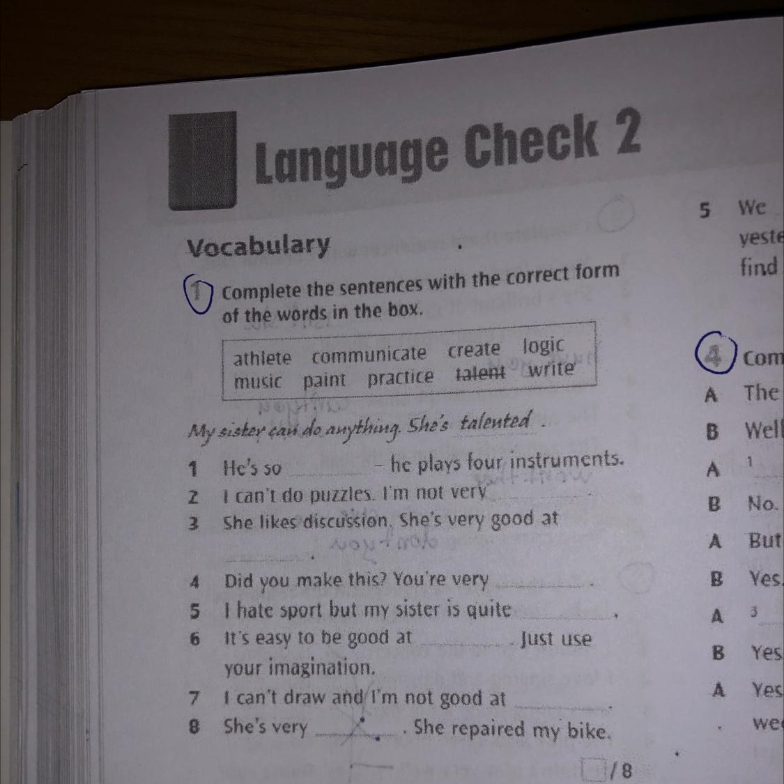 2. logical, 3. communicating, 4. creative, 5. athletic, 6. writing, 7. painting, 8. practical