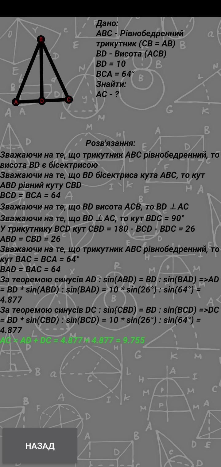 У рівнобедреному трикутнику АВОС відомо, що АВ- ВС - Кут B -64°. Знайдіть сторону АС і висоту BD - 10 см, трикутника.