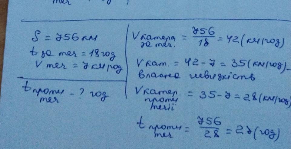 756 : 28 = 27 час - за 27 часов пройдет катер это расстояние против течения реки