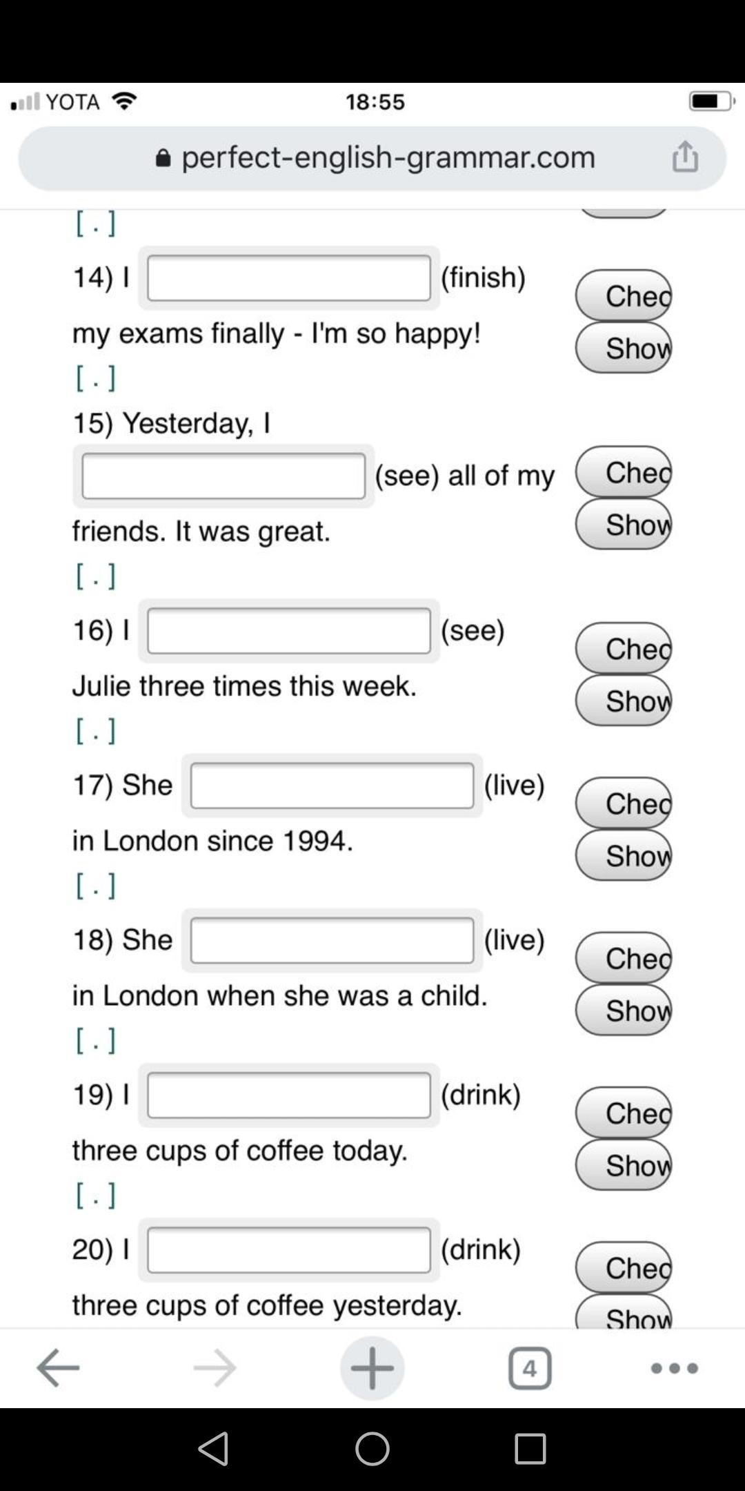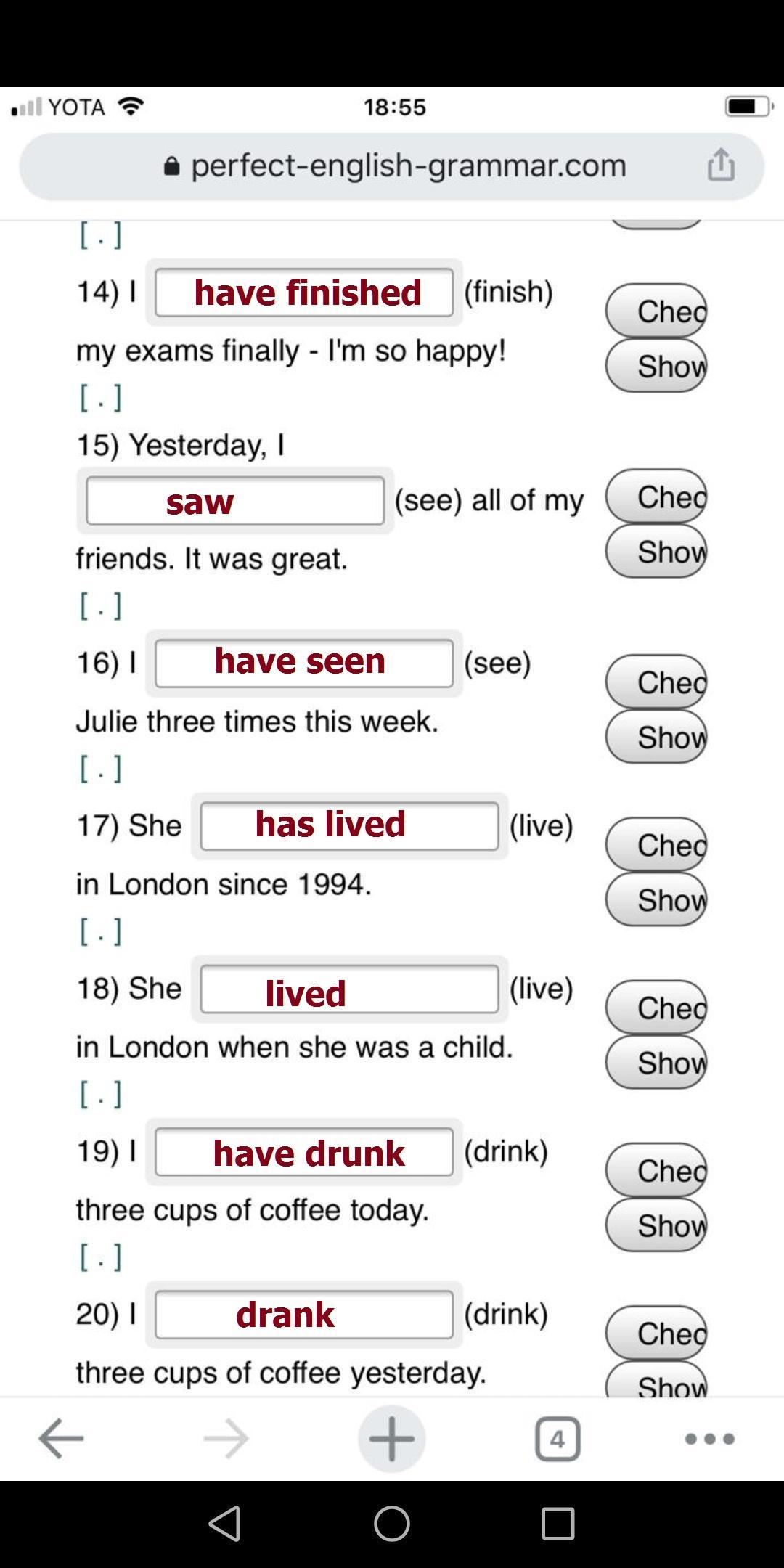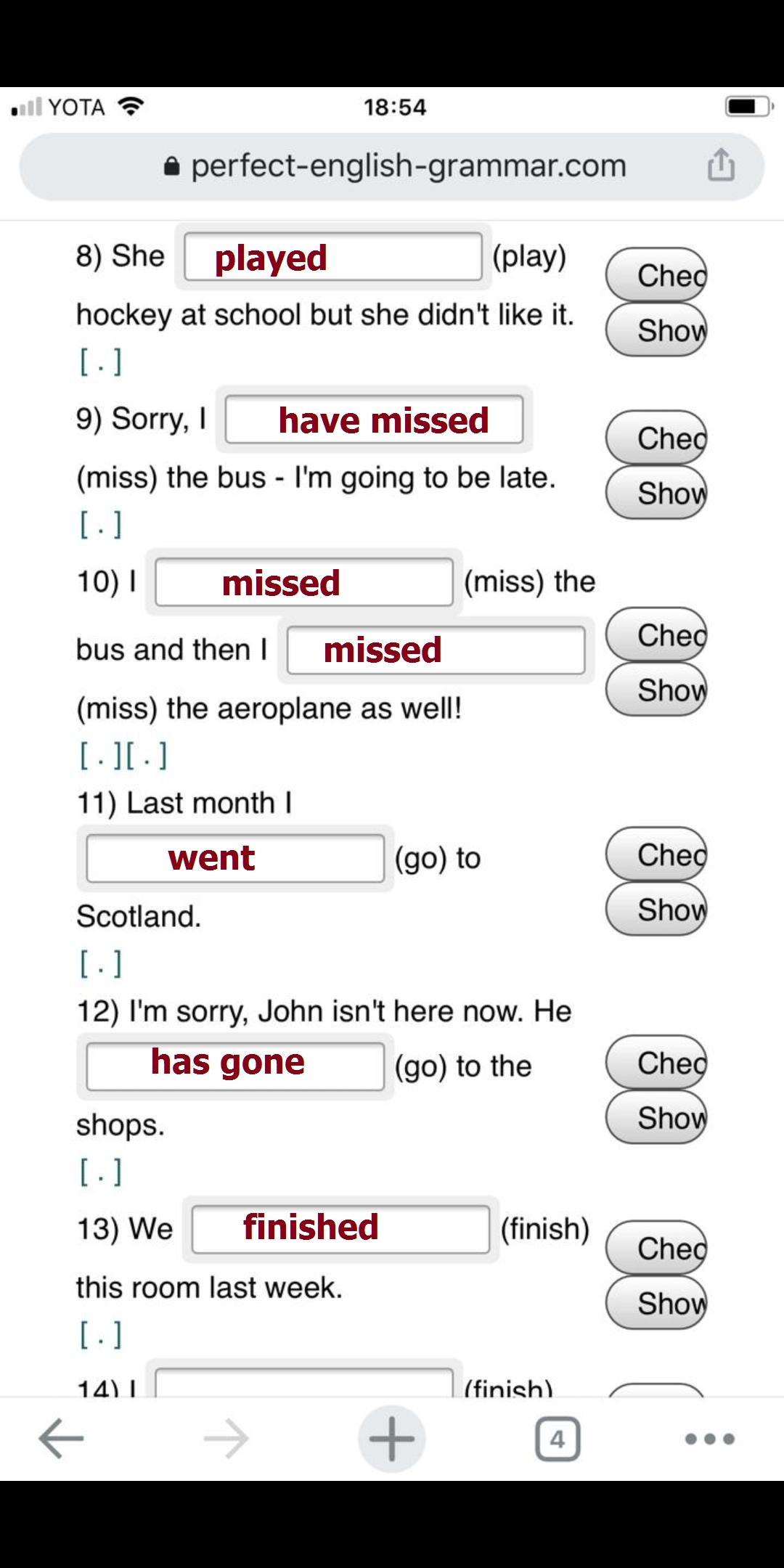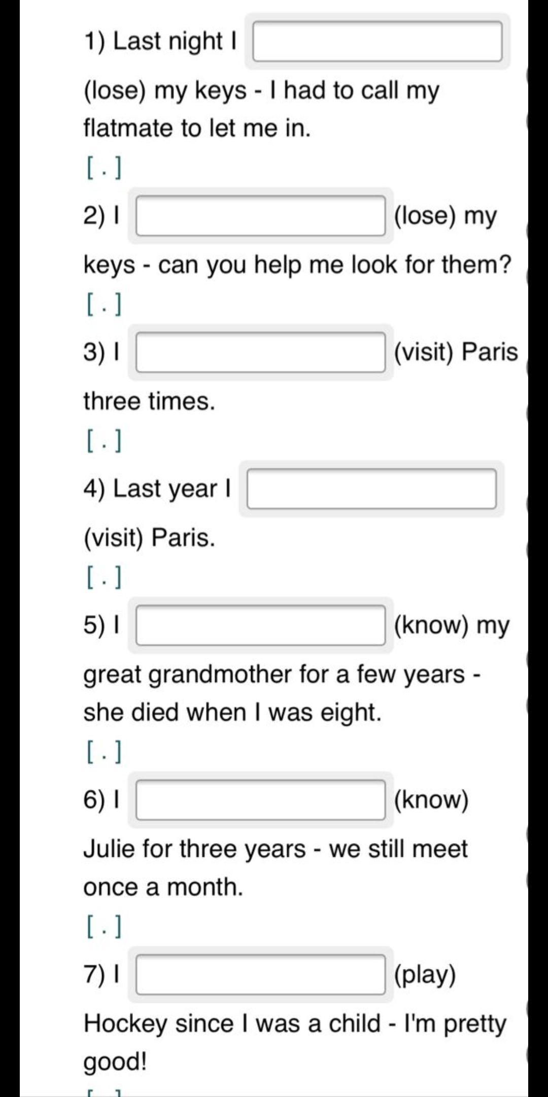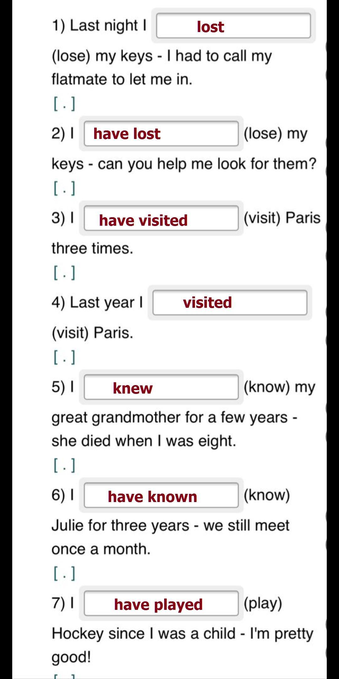 1. lost, 2. have lost, 3. have visited, 4. visited, 5. knew, 6. have known, 7. have played, 8. played, 9. have missed, 10. missed, missed, 11. went, 12. has gone, 13. finished, 14. have finished, 15. saw, 16. have seen, 17. has lived, 18. lived, 19. have drunk, 20. drank