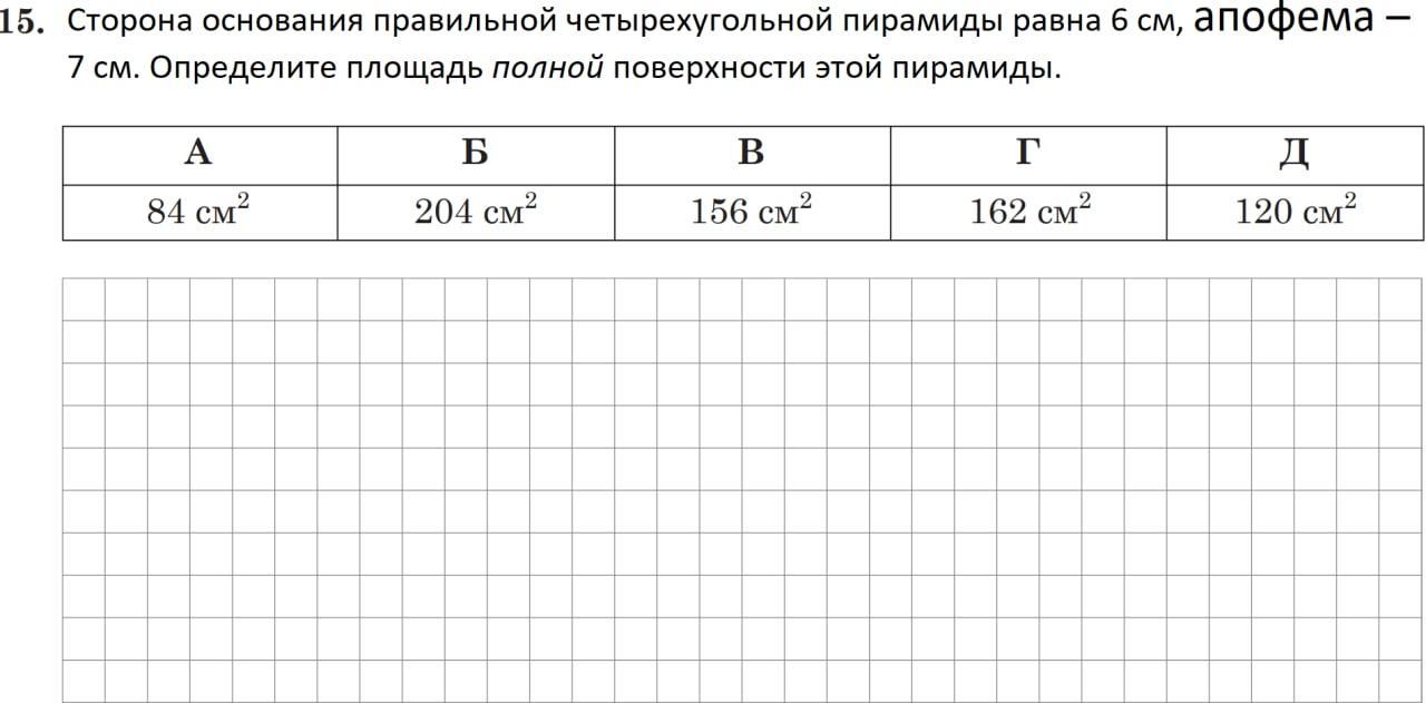 №15. Сторона основания правильной четырехугольной пирамиды равна 6 см, апофема – 7 см. Определите площадь полной поверхности этой пирамиды.
