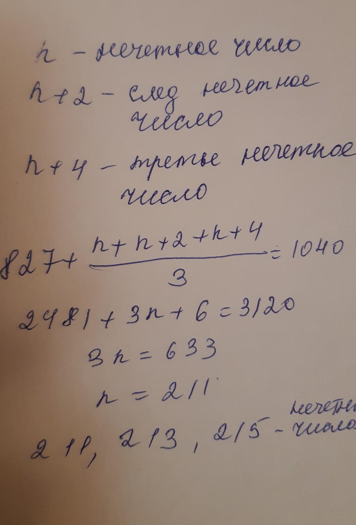 1)Сумма числа 827 и среднего арифметического трёх последовательных нечётных натуральных чисел равна 1040. Найдите эти числа.