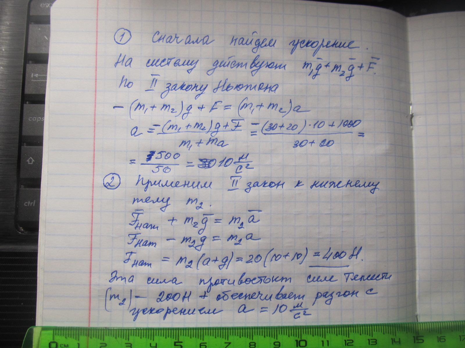 96. Два связанных тела массами m1=30 кг и m2=20 кг движутся вертикально вверх под действием силы F=1 кН. Чему равна сила натяжения нити ?
