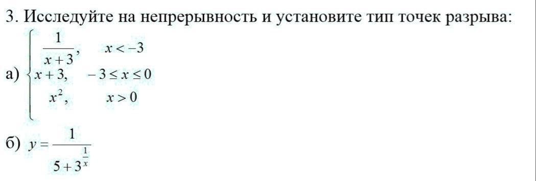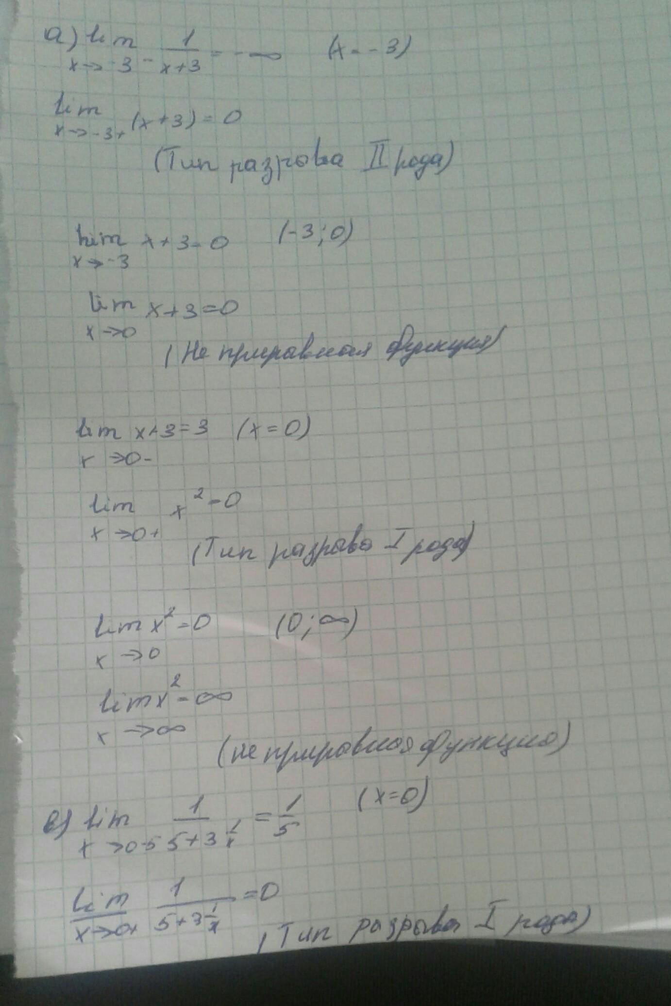 в случае а) два разрыва: в точке (-3) разрыв второго рода, ибо левый предел равен -беск, и неустранимый разрыв первого рода в точке (0), ибо левый и правый пределы конечны, но не равны (3) и (0)