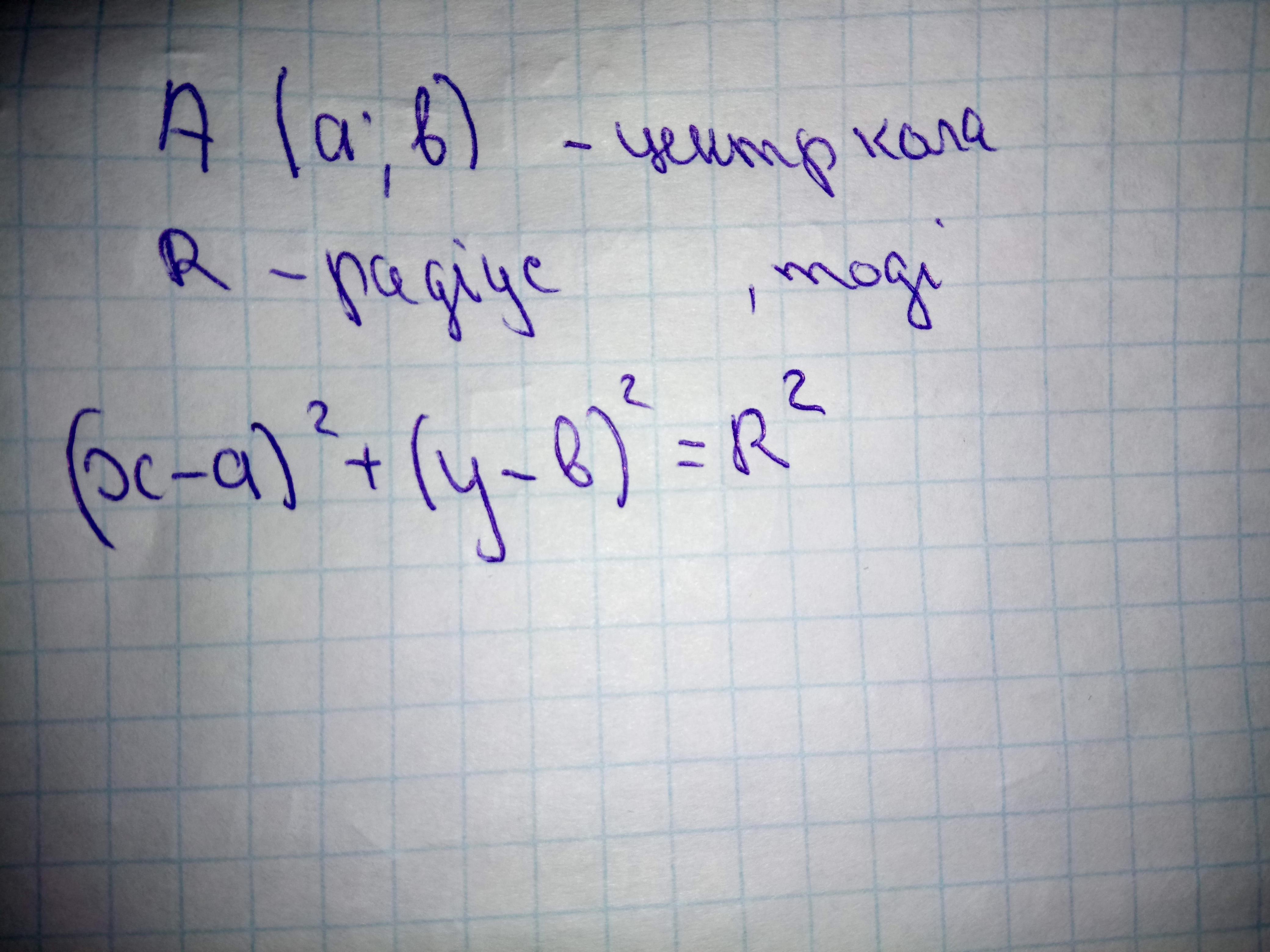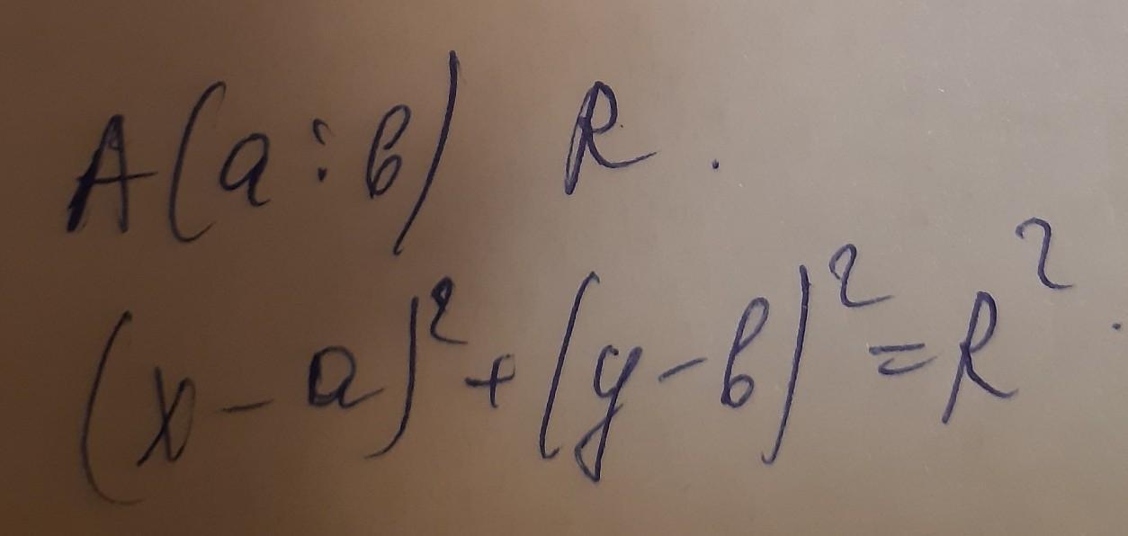 очень срочно нужна помощь❗❗❗❗❗ Рiвняння кола з центром у довiльнiй точцi А (а; b) i радiусом R мае вигляд??????????