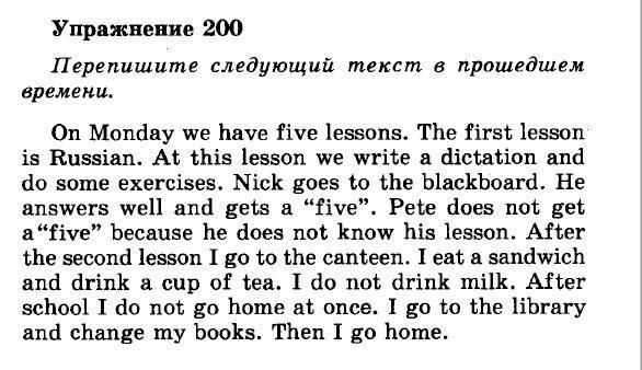 On Monday we had five lessons. The first lesson was Russian. At that lesson we wrote a dictation and did some exercises. Nick went to the blackboard. He answered well and got a "five". Pete didn't get a "five" because he didn't know his lesson. After the second lesson I went to the canteen. I ate a sandwich and drank a cup of tea. I didn't drink milk. After school I didn't go home at once. I went to the library and changed my books. Then I went home.