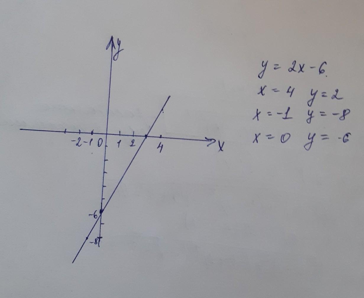 Побудуйте графік функції у = 2х - 6. Користуючись графіком, знайдіть значення функції, якщо значення аргументу дорівнює: 4; -1; 0.