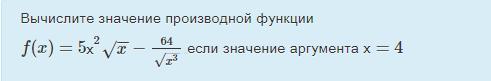 f(x)=5x^{2}\sqrt{x} -\dfrac{64}{\sqrt{x^{3}}}=5x^{2}\cdot x^{0,5}-64\cdot x^{-1,5} =5x^{2,5}-64x^{-1,5}\\\\f'(x)=5\cdot (x^{2,5})'-64\cdot (x^{-1,5})'=5\cdot 2,5x^{1,5}-64\cdot (-1,5)x^{-2,5} }=\\\\=12,5\sqrt{x^{3}}+\dfrac{96}{\sqrt{x^{5}}} =12,5x\sqrt{x}}+\dfrac{96}{x^{2} \sqrt{x}}} \\\\\\f'(4)=12,5\cdot 4\cdot \sqrt{4} +\dfrac{96}{4^{2}\cdot \sqrt{4}}=50\cdot 2+\dfrac{96}{16\cdot 2} =100+3=\boxed{103}