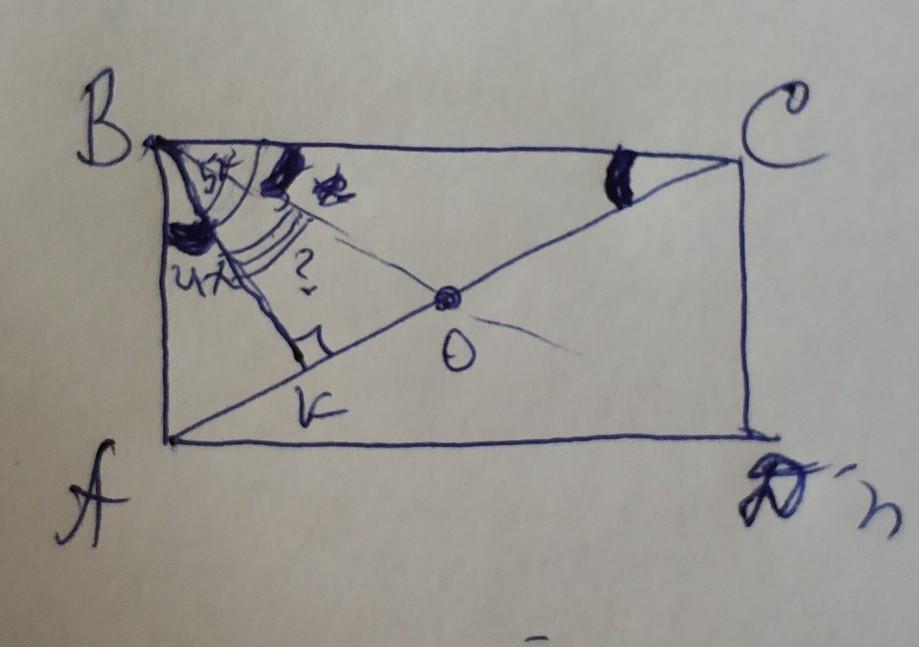 Перпендикуляр проведений з вершини прямокутника до його діагоналі, ділить кут який відноситься як 4:5. Знайдіть кут між перпендикуляром та іншою діагоналлю
