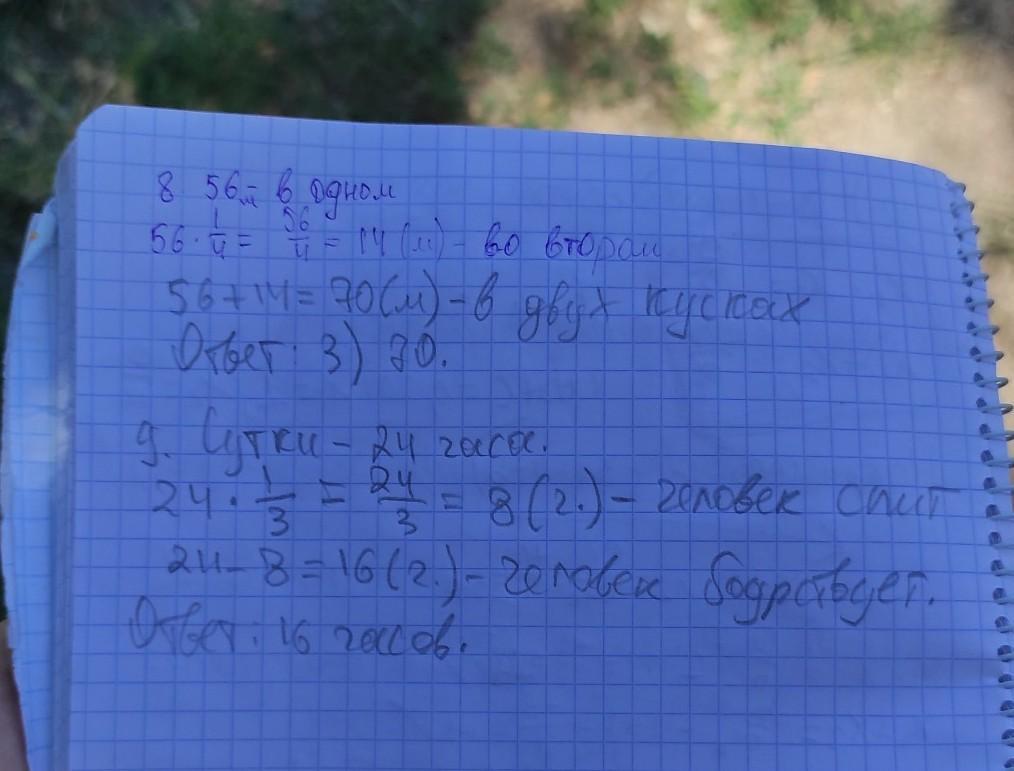 8. В одном куске материи 56 м, во втором — четвёртая часть того, что в первом куске. Сколько материи в двух кусках? 1) 60 м 2) 52 м 3) 70 м 9. Человек спит третью часть суток. Сколько часов человек бодрствует?