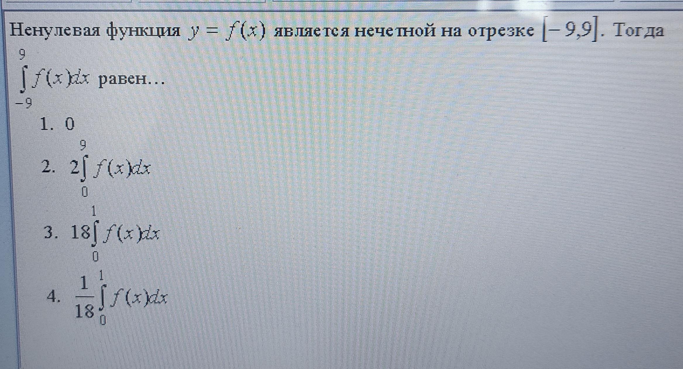 f(x) - нечетная функция, то есть f(-x)=-f(x). Ответ можно было бы дать исходя из геометрического смысла интеграла, но мы поступим иначе: