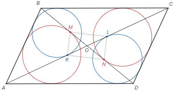 Дан параллелограмм ABCD. Окружности, вписанные в треугольники ABD и BDC, касаются диагонали BD в точках M и N соответственно. Окружности, вписанные в треугольники ABC и ADC,