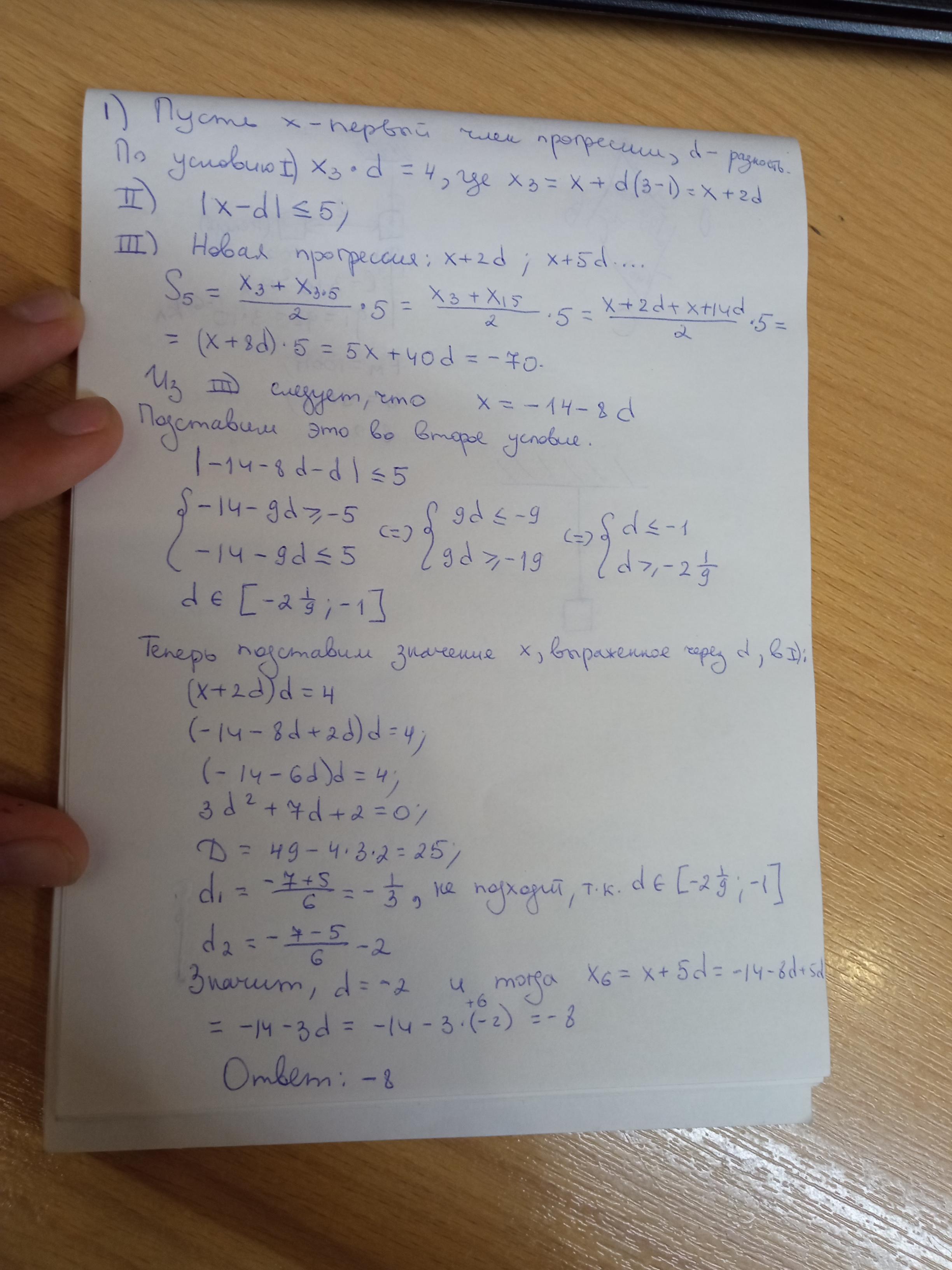 Дана арифметическая прогрессия. Если третий член этой прогрессии умножить на разность этой прогрессии, то получается число 4. Известно, что разность между первым членом этой прогрессии и разностью этой прогрессии не превосходит по абсолютной величине число 5. Если из этой прогрессии последовательно выбрать члены, номера которых нацело делятся на 3, то получится новая последовательность. Сумма первых пяти членов этой новой последовательности равна -70. Найти значение шестого члена исходной арифметической прогрессии.
