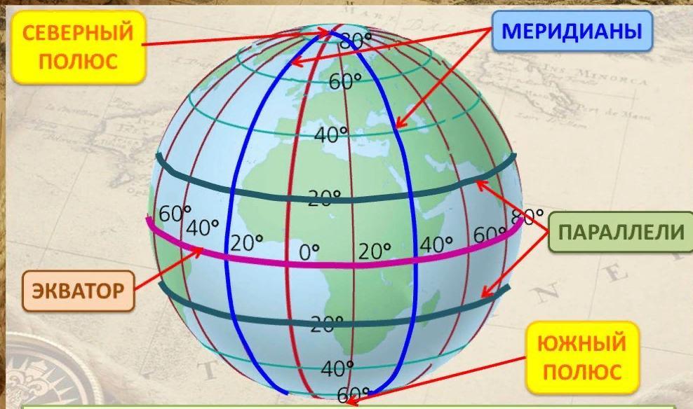 меридиан это линия от одного полюса к другому , а параллель это линия параллельна экватору