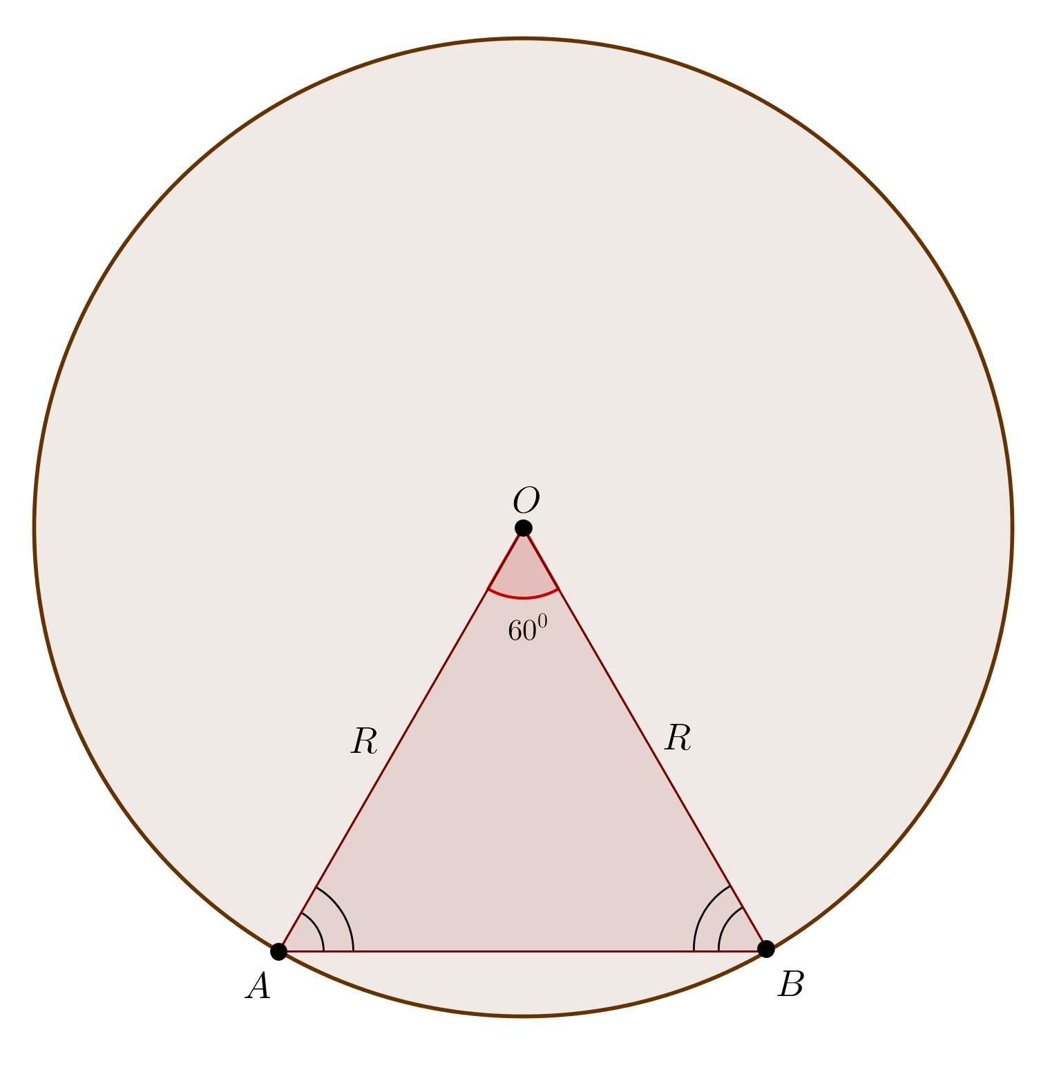Так, як хорду видно з цента кола під кутом , то зробивши рисунок, два радіуси і хорда утворюють рівнобедренний трикутник із кутом між ними(радіусами)