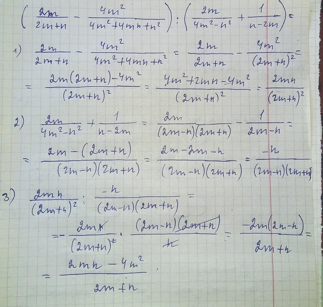 (2m/(2m+n) -4m²/(4m²+4mn +n²)) : (2m/(4m²-n²)+1/(n- 2m))