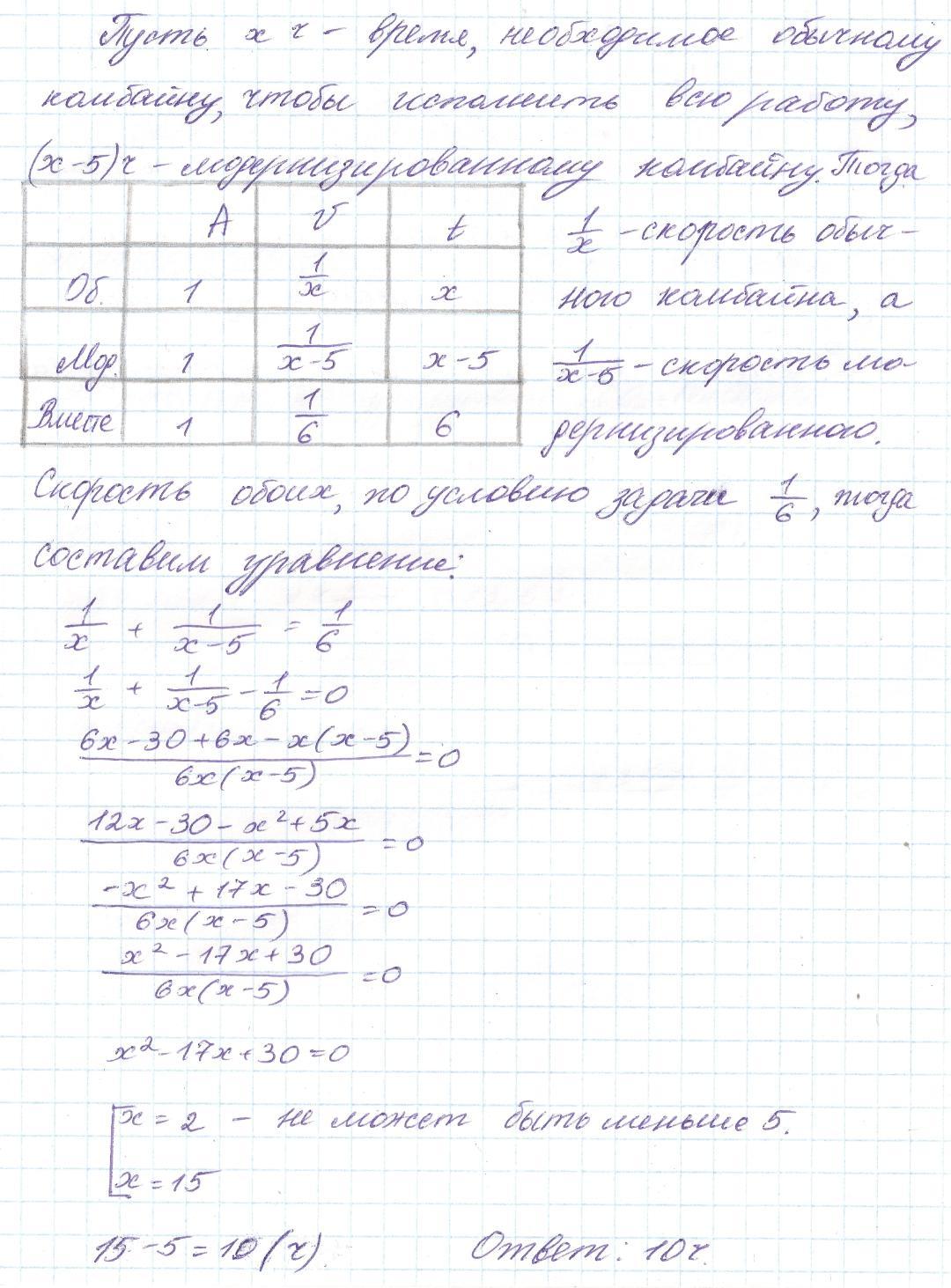 Пусть модернизированный комбайн может выполнить задание за х часов, тогда обычный комбайн это же задание может выполнить за х+5 часов.