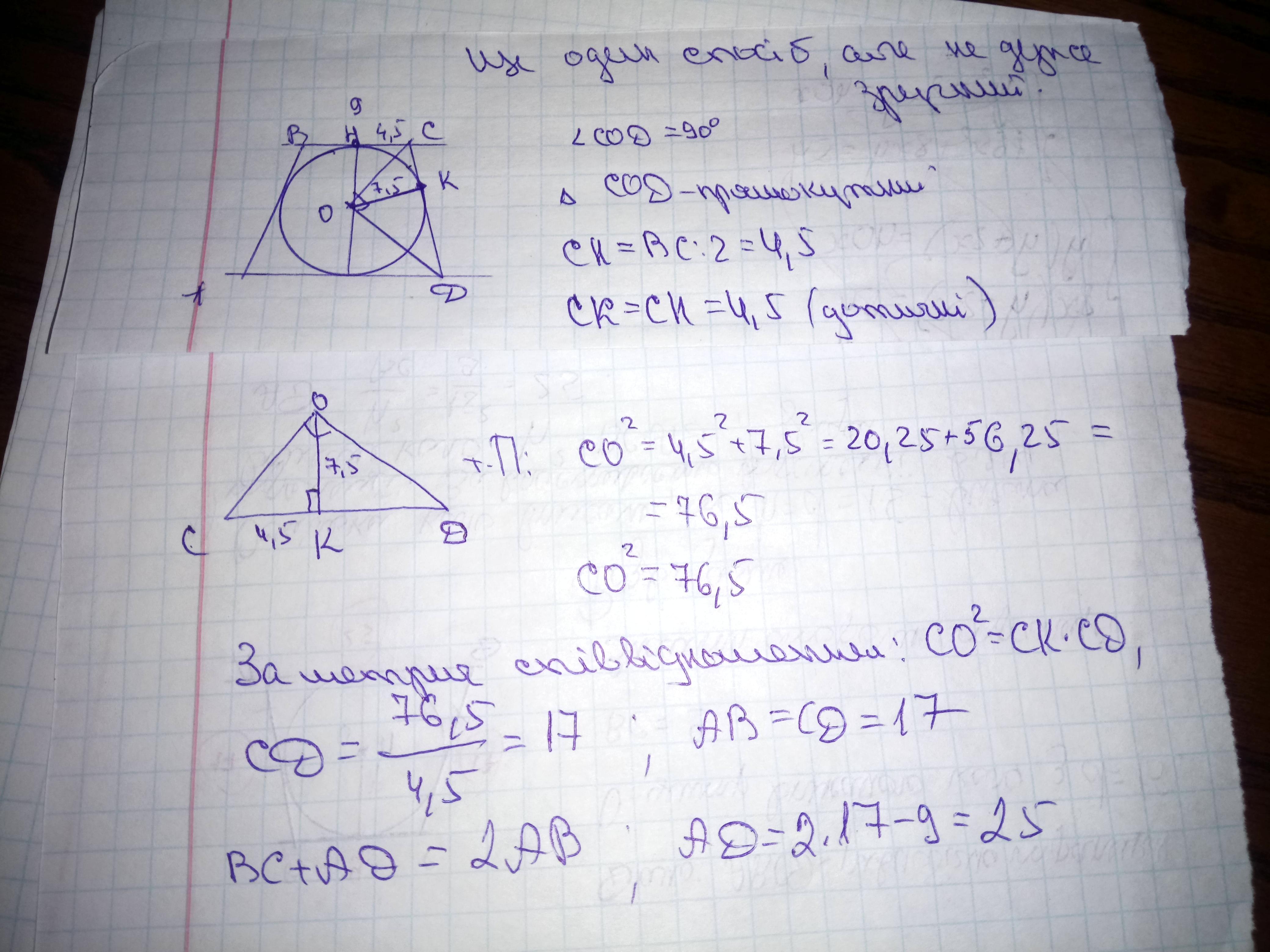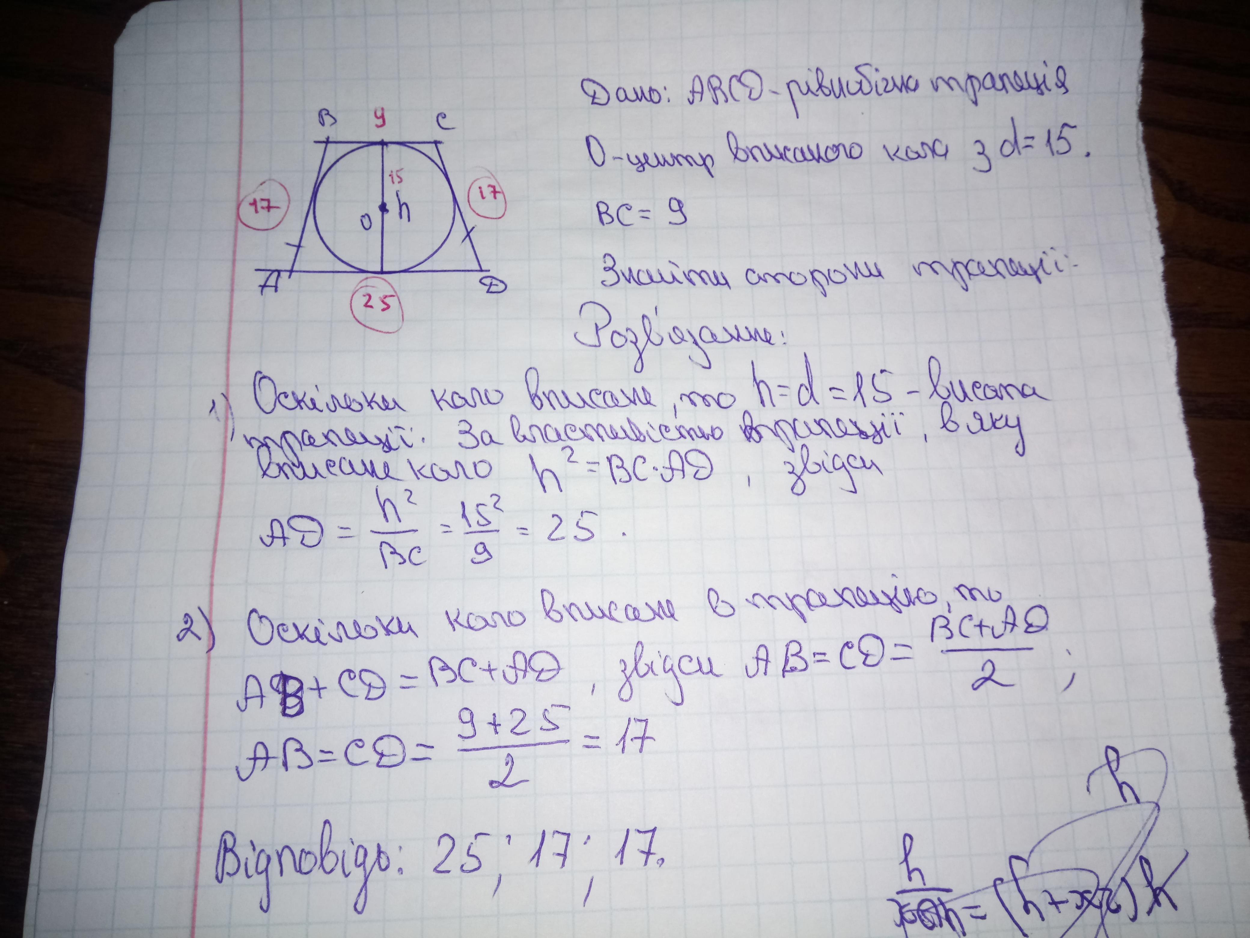 Діаметр кола вписаного в рівнобічну трапецію 15. А менша основа трапеції 9. Знайти сторони трапеції