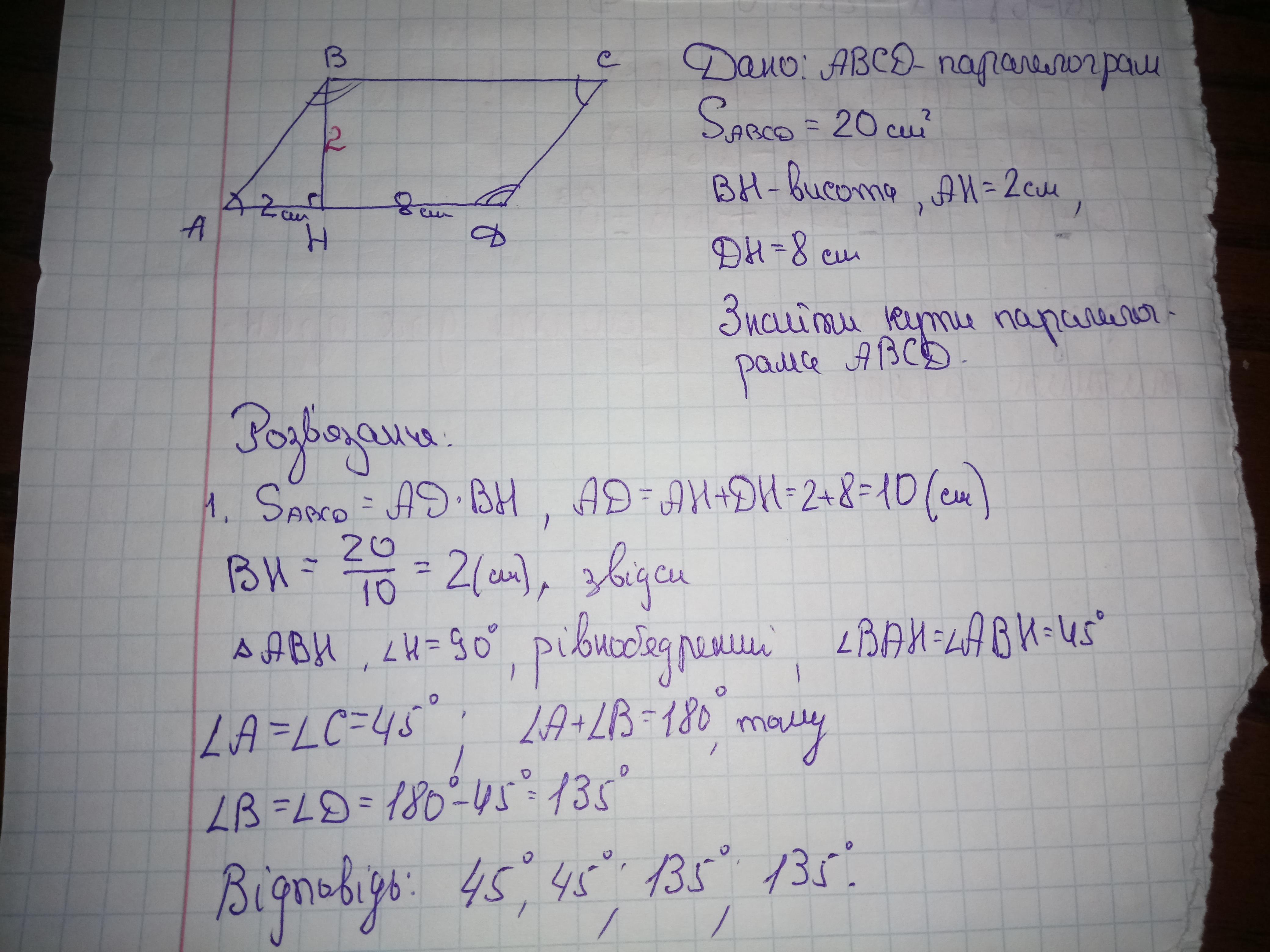 знайти кути паралелограма якщо його площа дорівнює 20 см^2 ,а висота що проведена з вершини тупого кута ділить одну із сторін на відрізки 2 см і 8 см рахуючи від вершини гострого кута