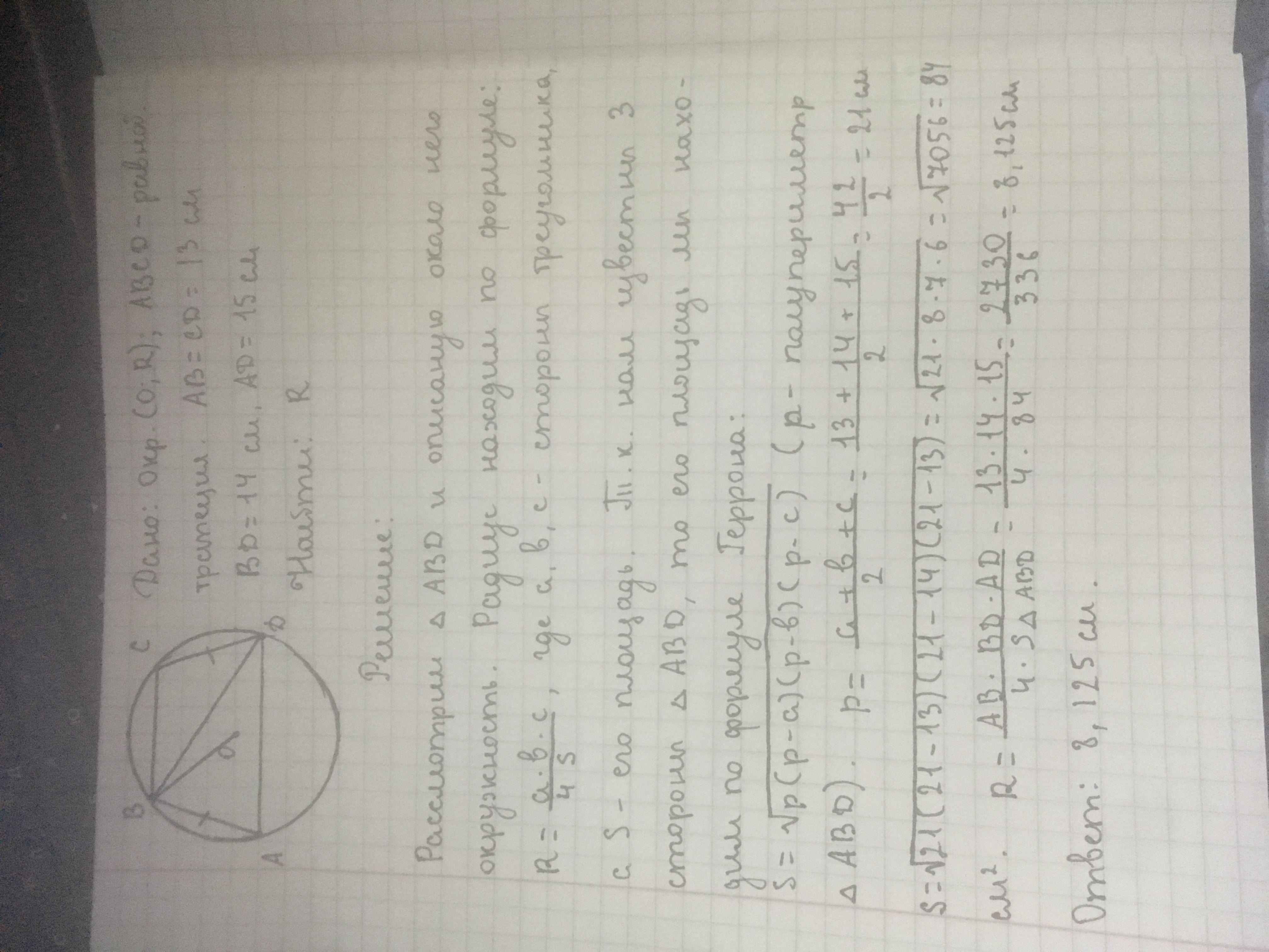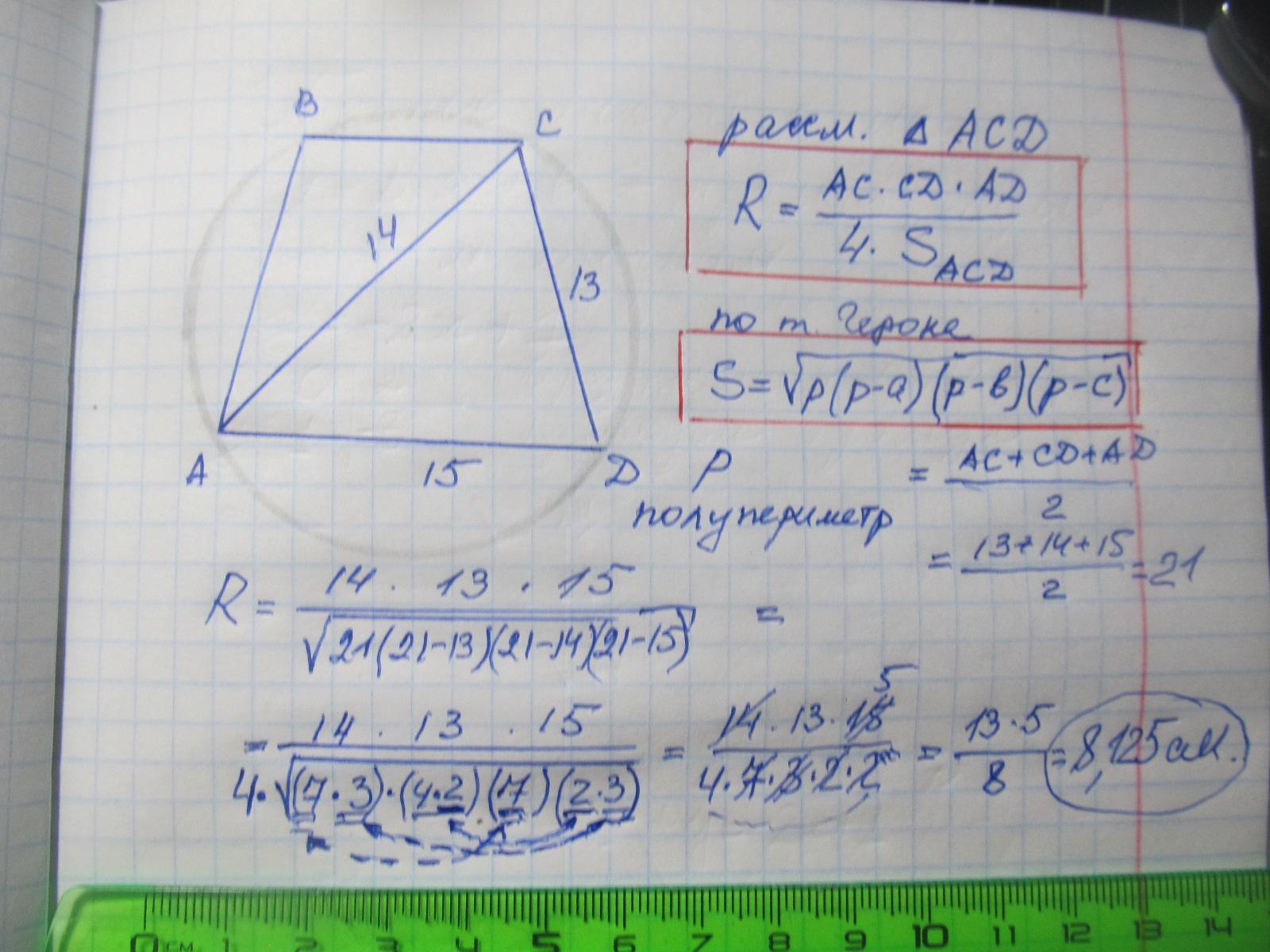 Знайдіть радіус кола, описаного навколо рівнобедрінної трапеції, бокова сторона якого дорівнює 13см, діагональ- 14см і більша основа - 15см.