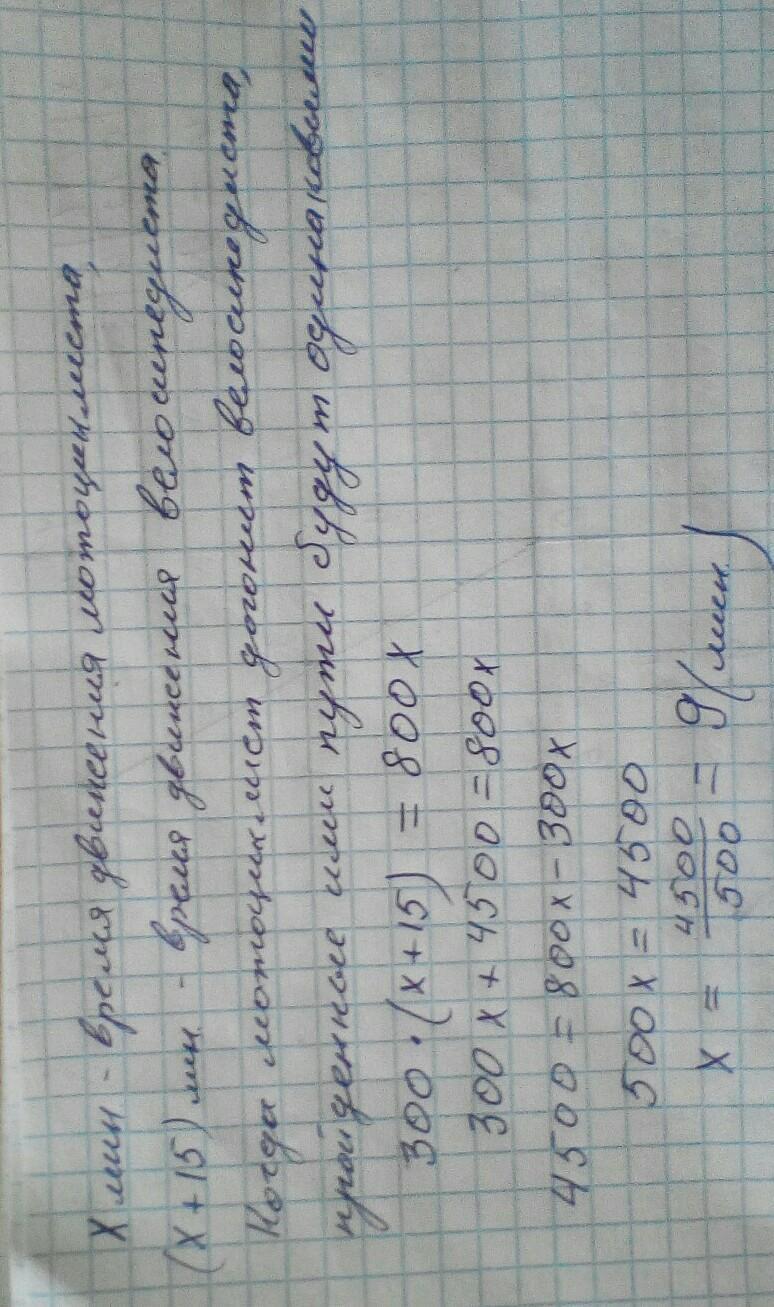 Из поселка в город со скоростью 300 м в минуту выехал велосипедист. через 15 минут вслед за велосипедистом выехал мотоциклист со скоростью 800 м в минуту. через сколько минут после своего выезда мотоциклист догонит велосипедиста?