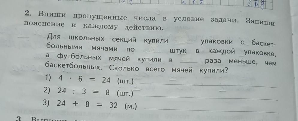 впиши пропущенные числа в условие задачи.Запиши пояснения каждому действию .