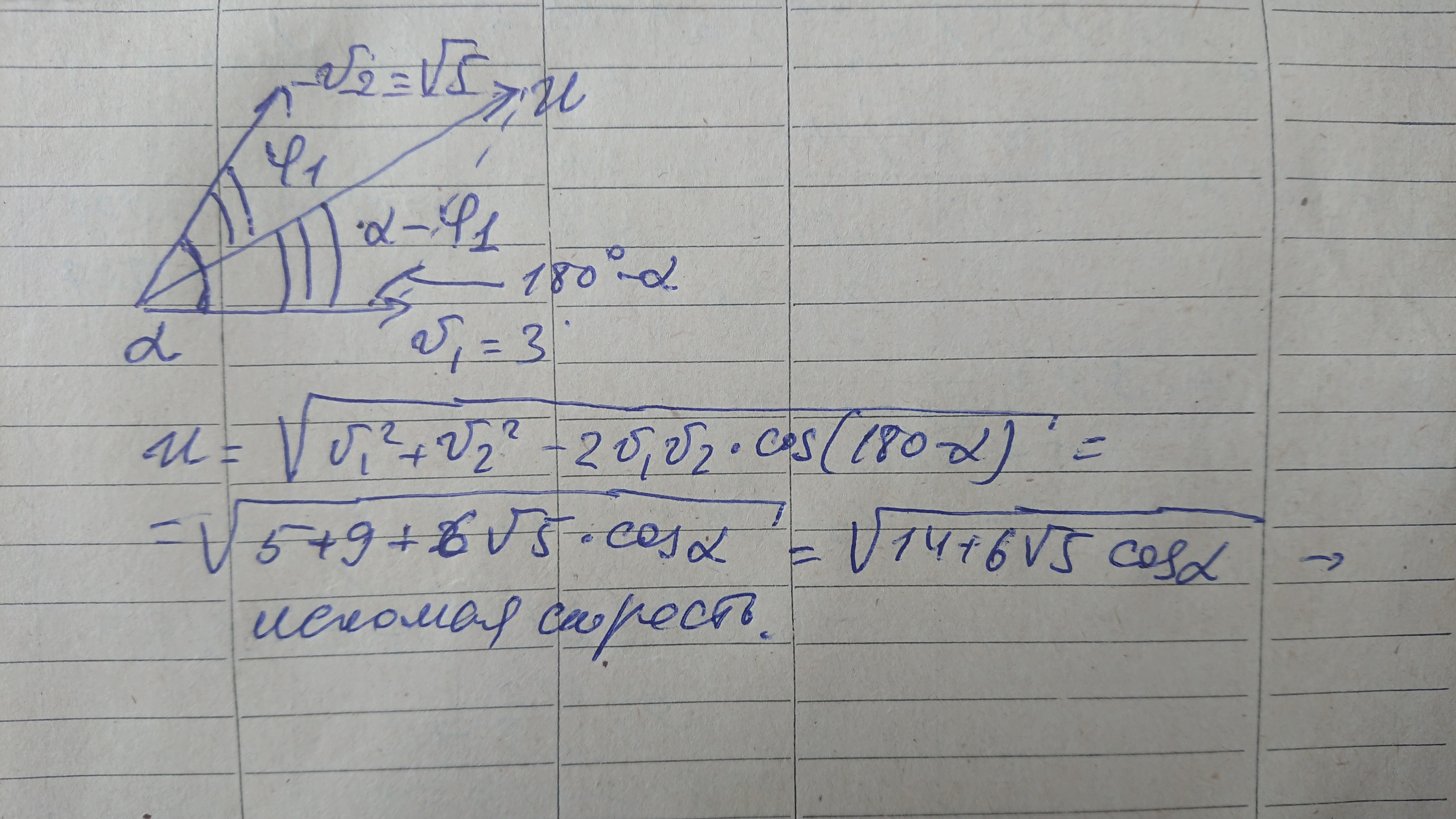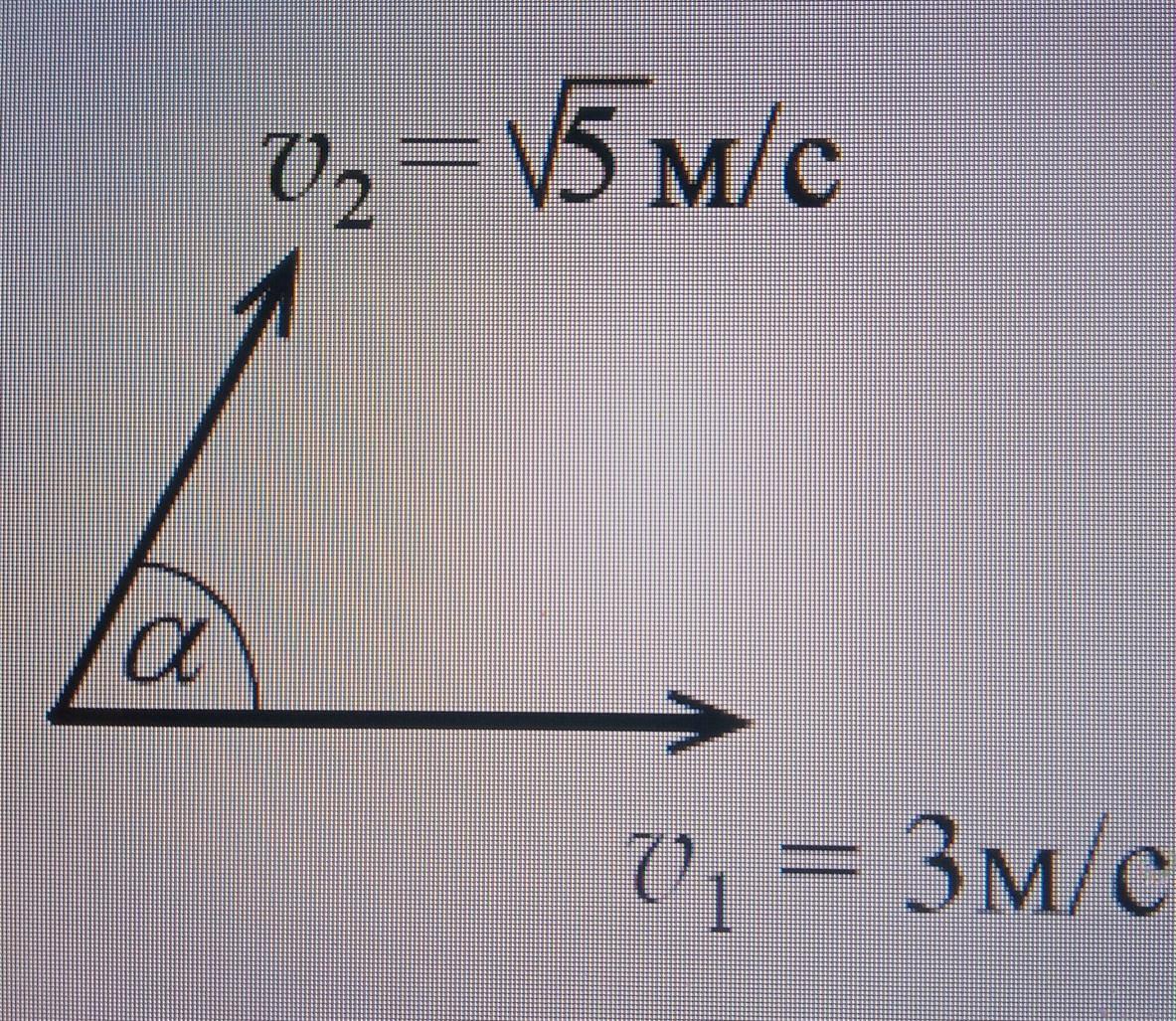 Баржу перемещают с помощью двух буксиров, движущихся со скоростями 3 м/с и 5 м/с, образующими угол а (рис. 56), тангенс которого равен tga = 2. Тросы, с помощью которых буксируют баржу, нерастяжимы и прикреплены к одной точке баржи. Под каким углом В к скорости і, будет направлена скорость точки крепления тросов и че- му равна скорость этой точки? Воспользоваться формулой для косину- са разности двух углов cos(а - в) = cos a cos B + sin a sin В.