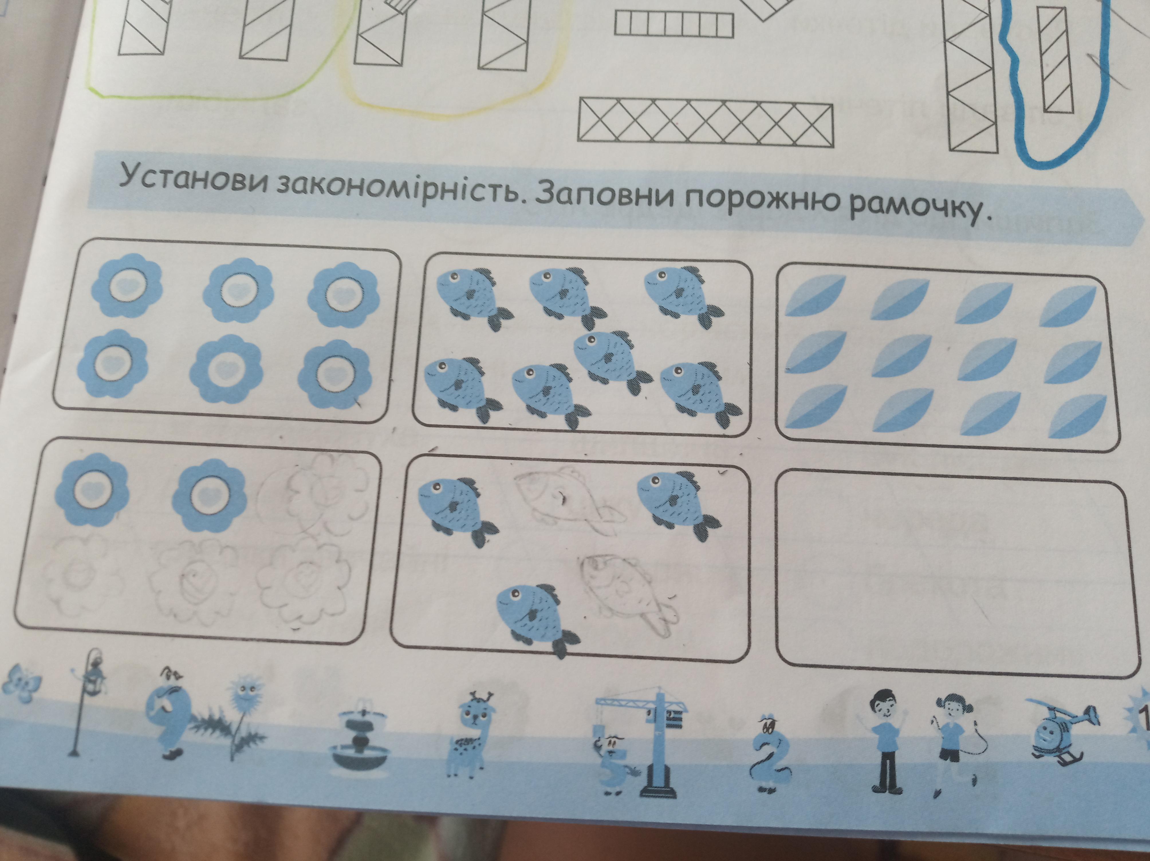 закономірність: в кожної нижньої рамці на 4 предмета менше, ніж у верхній.