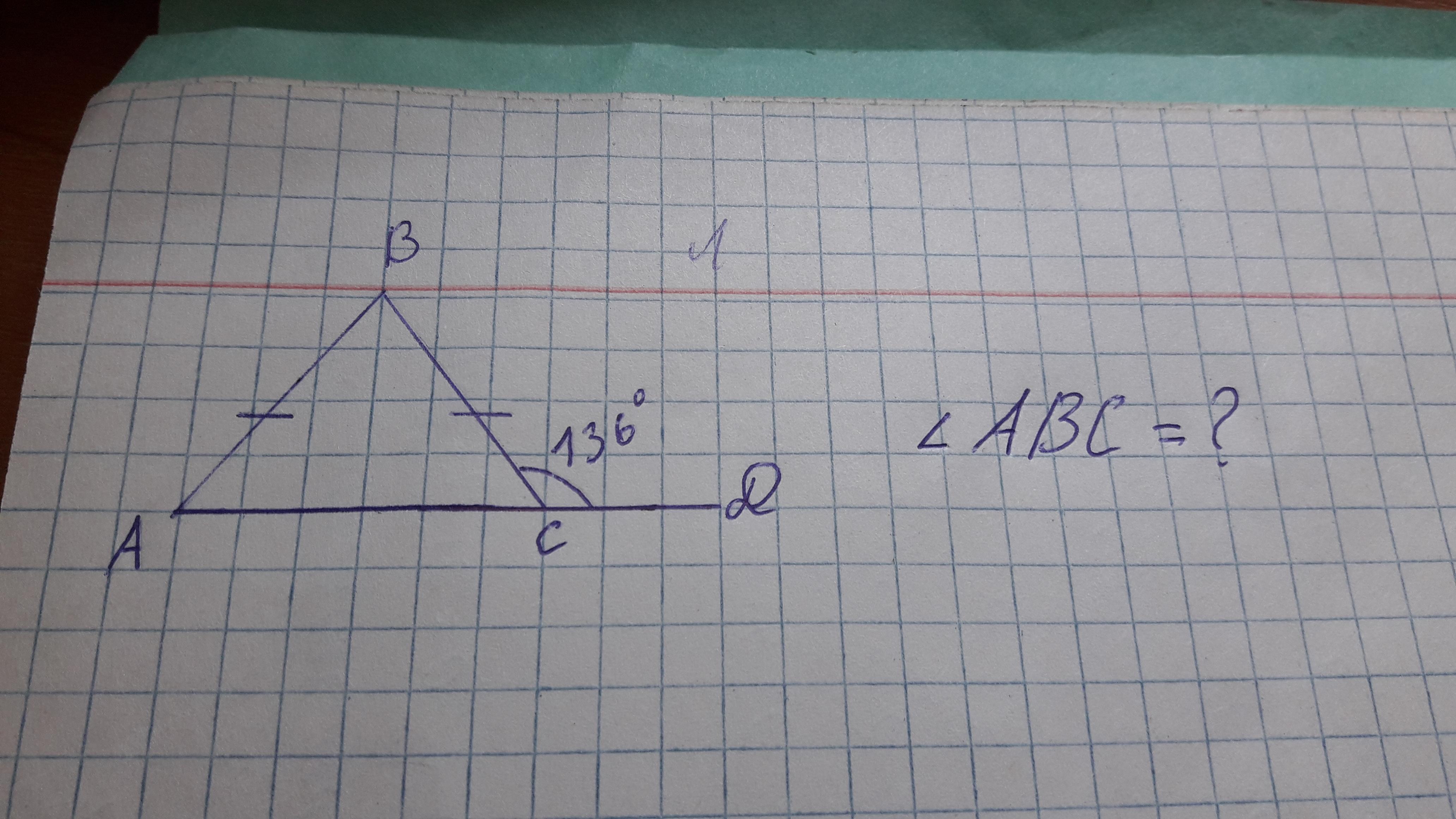 ∠ACB=180°-∠DCB=180°-136°=44° (смежные)