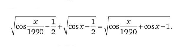 если выражение под первым корнем обозначить а=cos(x/1990)-(1/2); выражение под вторым корнем обозначить b=cos(x)-(1/2), то получится уравнение √a + √b = √(a+b)... это возможно только при а=0 или и=0