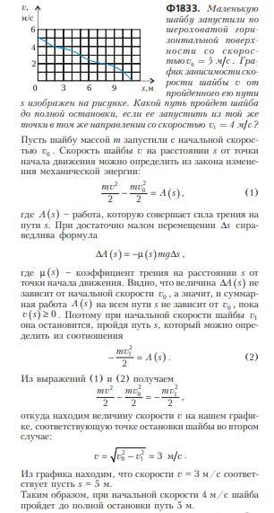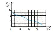 Маленькую шайбу запустили по шероховатой горизонтальной поверхности со скоростью v = 5 м/с. График зависимости скорости шайбы v от пройденного ею пути s изображен на рисунке. Какой путь пройдет шайба до полной остановки, если ее запустить из той же