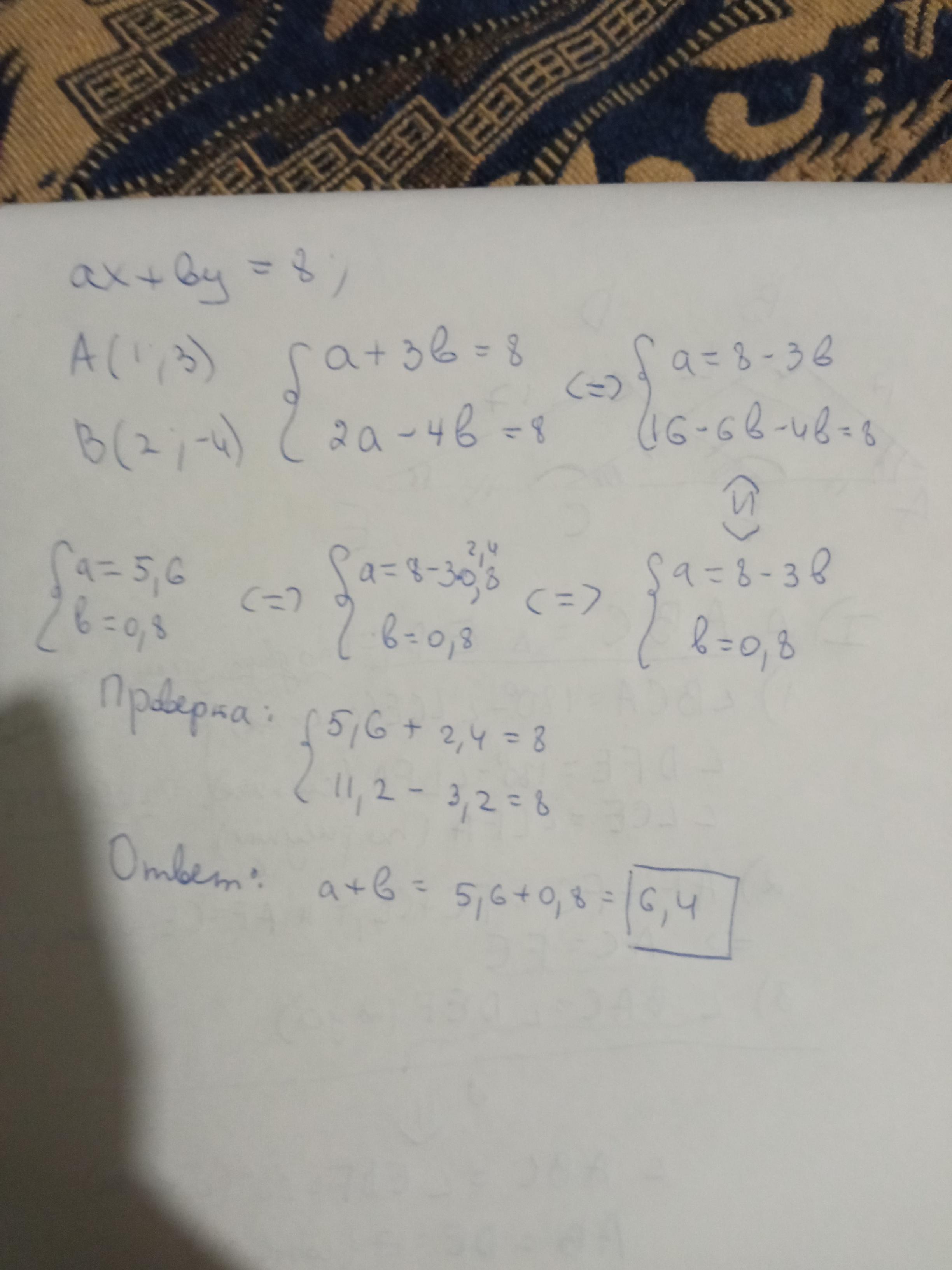 При каких значениях a и b график уравнения ax+by=8 проходит через точки A(1;3), B(2;−4)?
