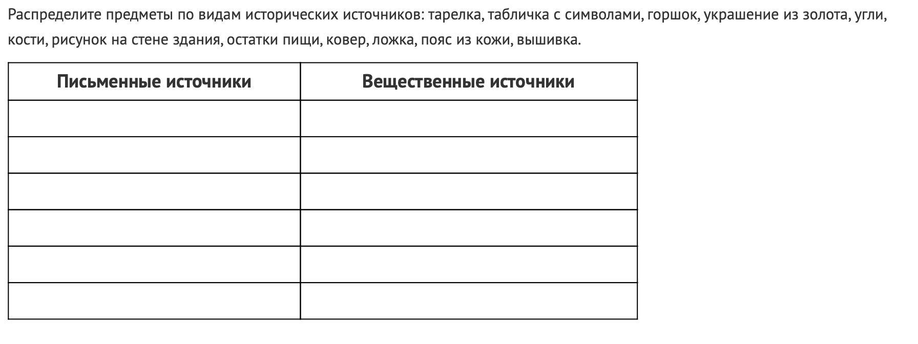 Вещественные источники: тарелка, горшок, украшение из золота, угли, кости, остатки пищи, ковер, ложка, пояс из кожи, вышивка.