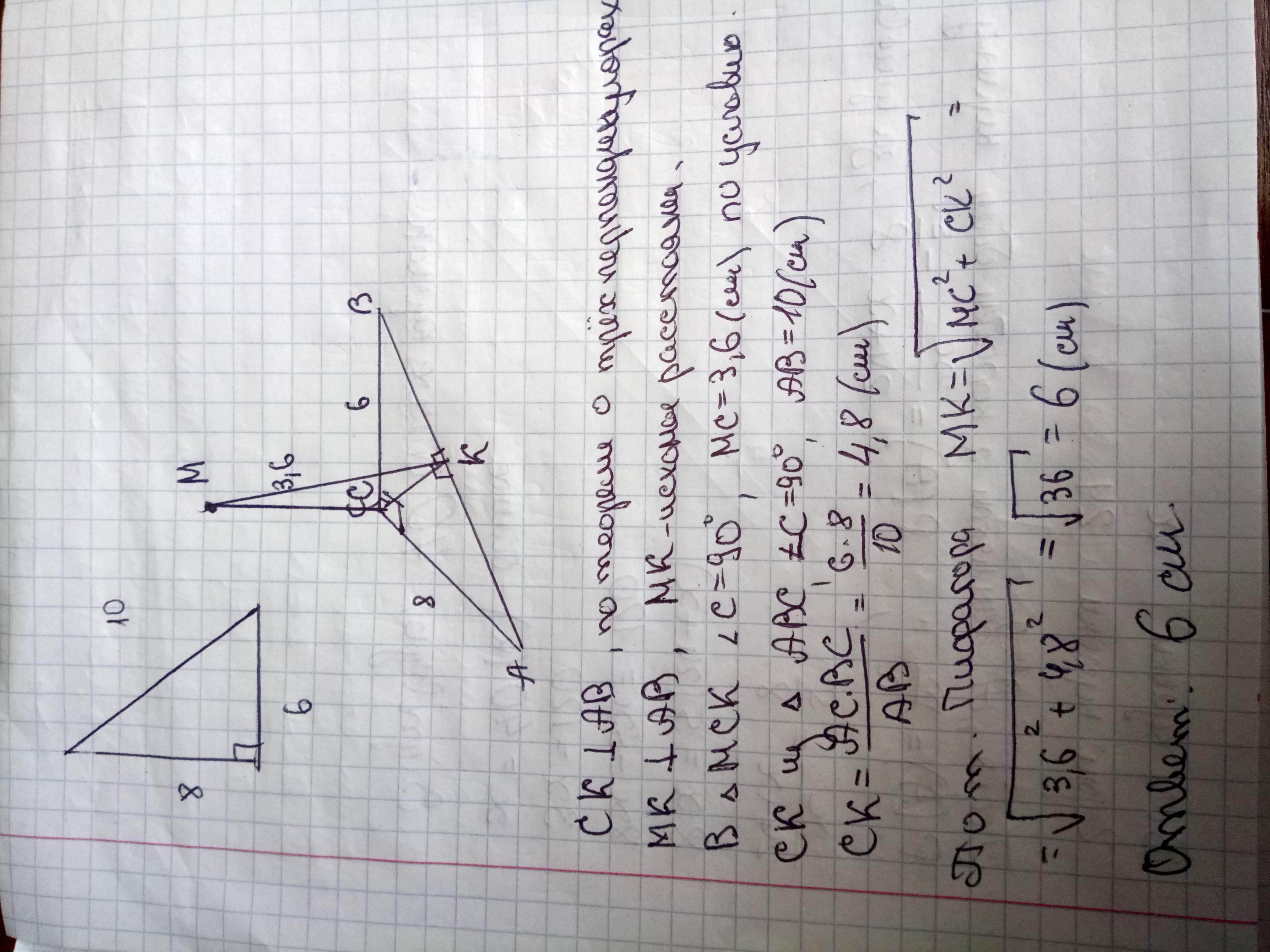 Катеты прямоугольного треугольника равны 6 см и 8 см,а длина перпендикуляра,проведенного из вершины прямого угла к плоскости треугольника,равна 3.6 см.Найдите расстояние от конца перпендикуляра,находящегося вне плоскости треугольника,до гипотенузы