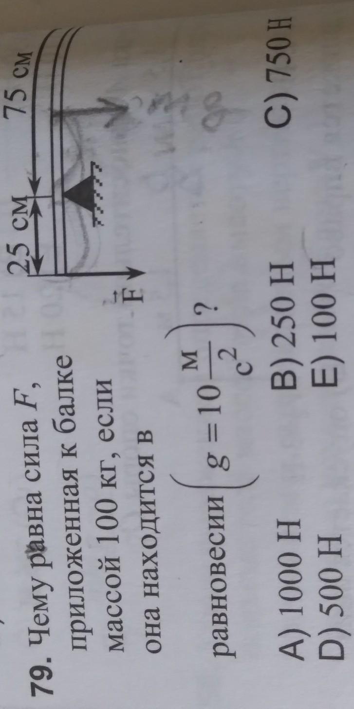 Чему равна сила F, приложенная к балке массой 100 кг, если она находится в равновесии g = 10м/с²