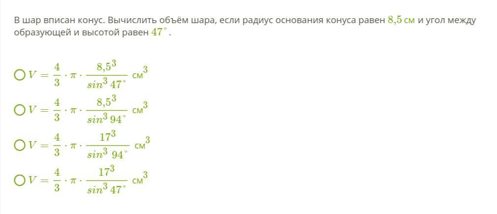 4) V = 4/3πR³ = (4/3π) · (8,5³ /sin³94°) = 4/3· π · (8,5³ /sin³94°) см³ - это второй вариант ответа из 4-х предложенных.