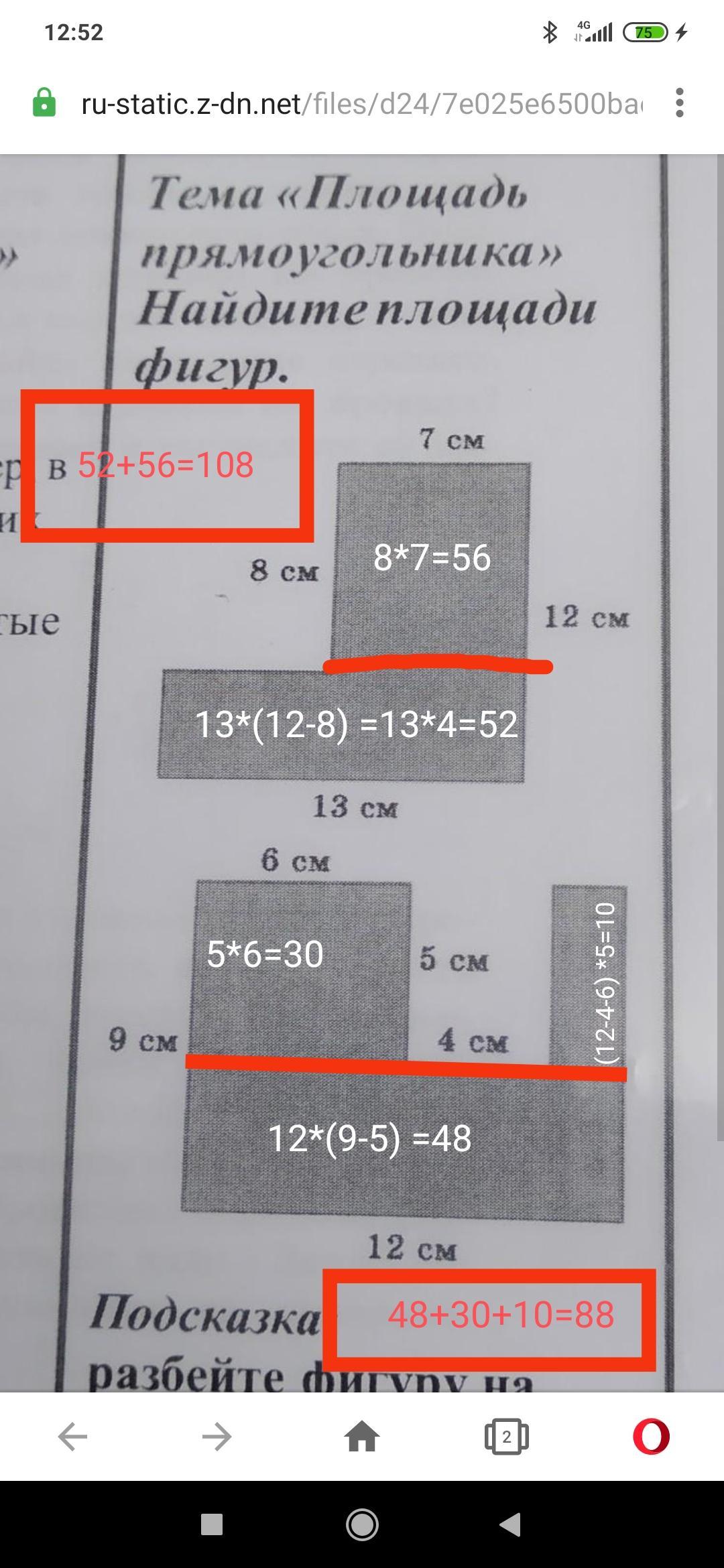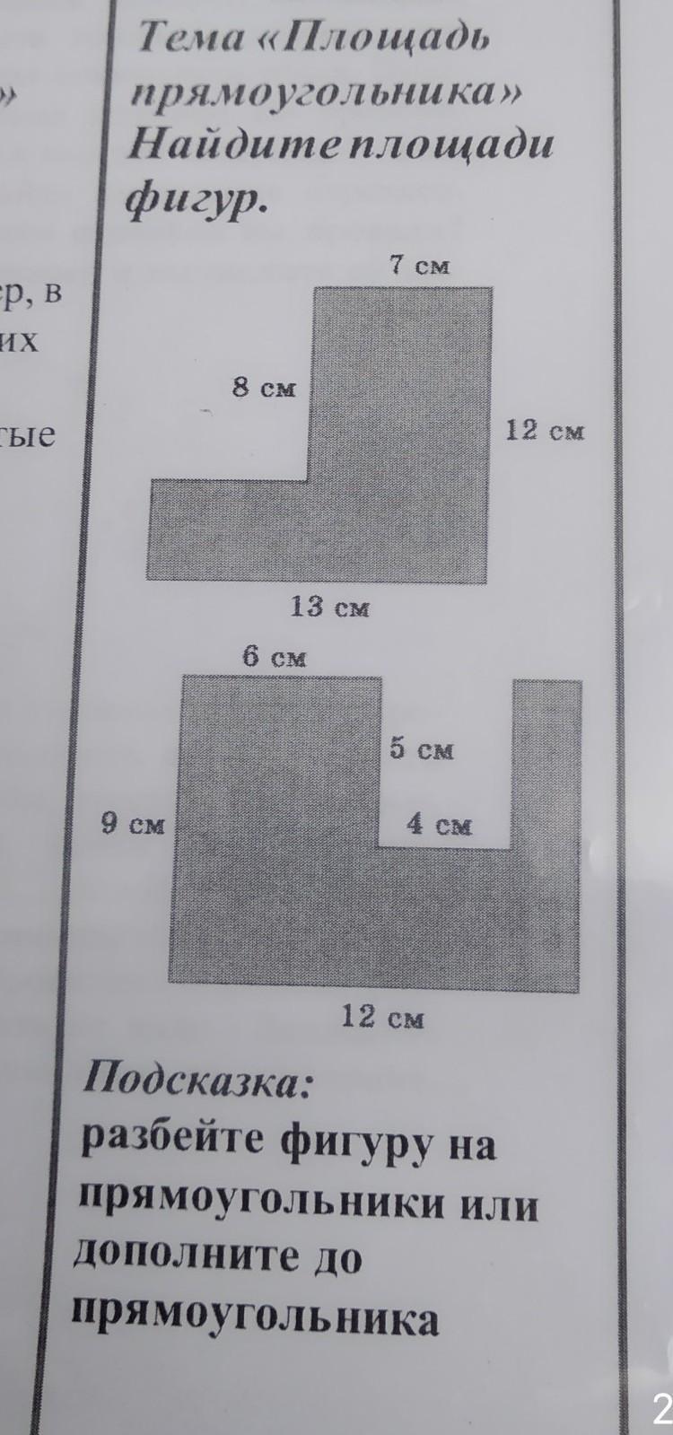 1) достроим фигуру до прямоугольника 13 на 12. Тогда искомая площадь будет равна разности всего прямоугольника и маленького белого прямоугольника внутри него. То есть 13 * 12 - 8 * 6 = 156 - 48 = 108
