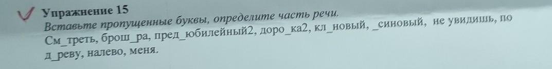 Упражнение 15 Вставьте пропущенные буквы, определите часть речи. См_треть, брош_ра, пред_юбилейный2, доро_ка2, кл_новый, _синовый, не увидишь, по д_реву, налево, меня.