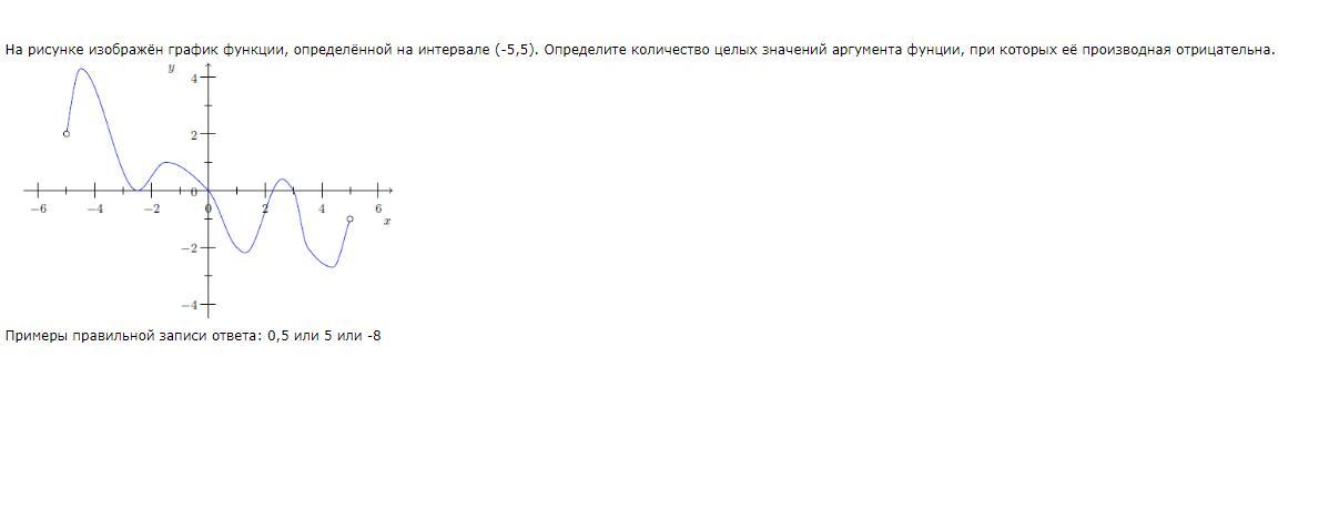 На рисунке изображён график функции, определённой на интервале (-5,5). Определите количество целых значений аргумента фунции, при которых её производная отрицательна.