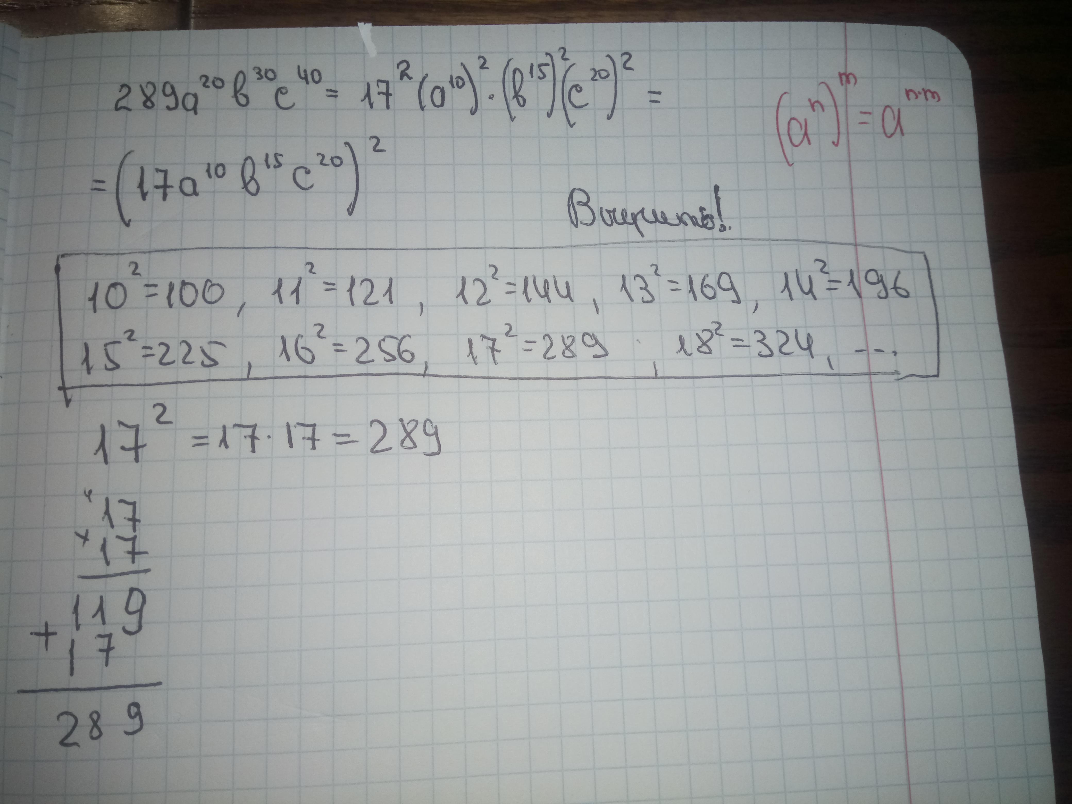 решаю летом задачи чтобы вспомнить 7 класс , так как я двоечник , вроде все хорошо , но я не могу понять , как получилось 17 в квадрате помогите плиз