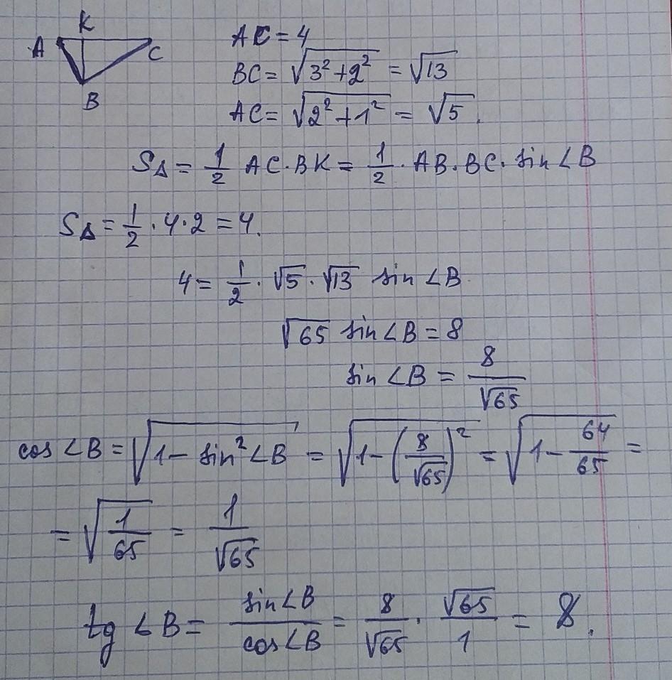 CosB=(13+5-16)/(2*√13*√5)=1/(√13*√5)=0.124;