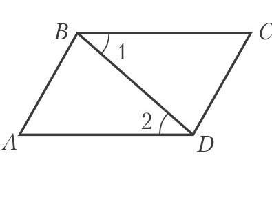 Рассмотрим треугольники ΔABD и ΔCDB. У них сторона BD — общая, AD = BC и ∠1 = ∠ 2 по условию. Стало быть, эти треугольники равны по двум сторонам и углу между ними.