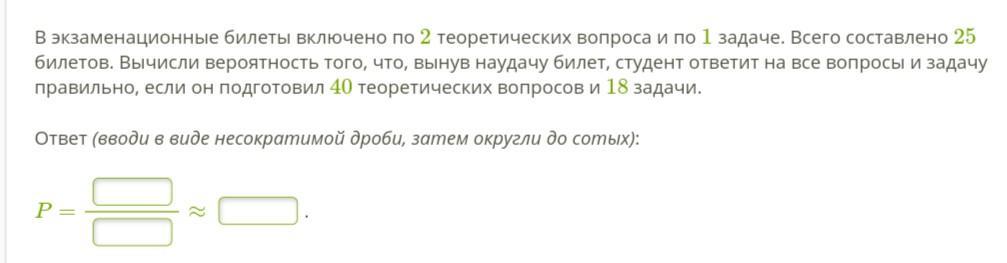 В экзаменационные билеты включено по 2 теоретических вопроса и по 1 задаче. Всего составлено 25 билетов. Вычислитот вероятность того, что, вынув наудачу билет, студент ответит на все вопросы и задачу правильно, если он подготовил 40 теоретических вопросов и 18 задачи.