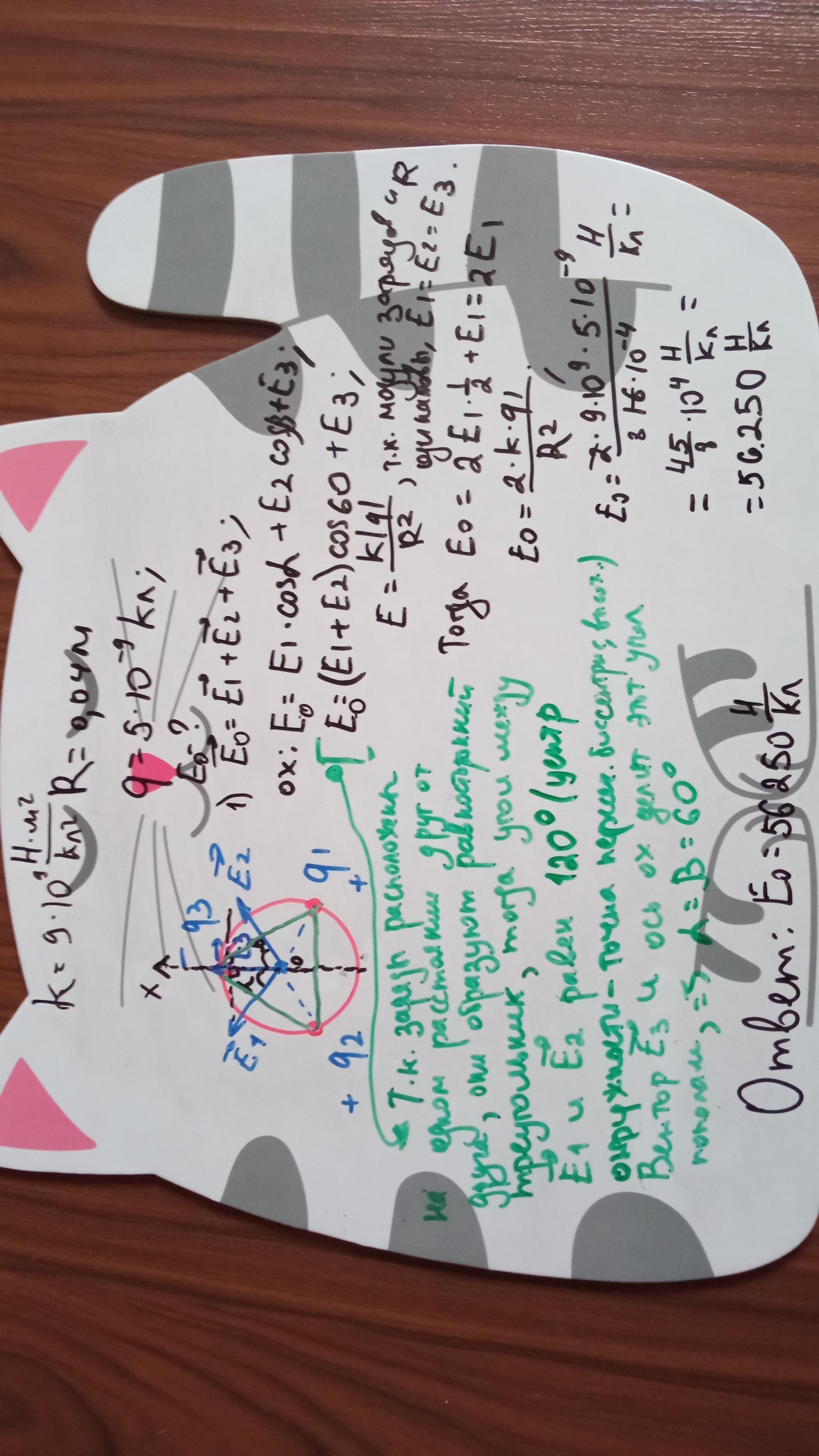 Три одинаковых по абсолютной величине точечных заряда, из которых два положительных и один отрицательный, расположены по окружности радиусом 0,04 м на одинаковом расстоянии друг от друга. Абсолютная величина каждого заряда равна 5 .10-9 Кл. Определите напряженность электрического поля в центре окружности