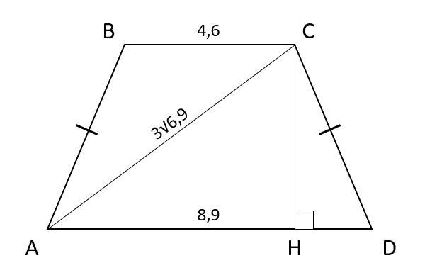 Дано: ABCD — трапеция, AB = CD, BC = 4,6, AD = 8,9, AC = 3√6,9