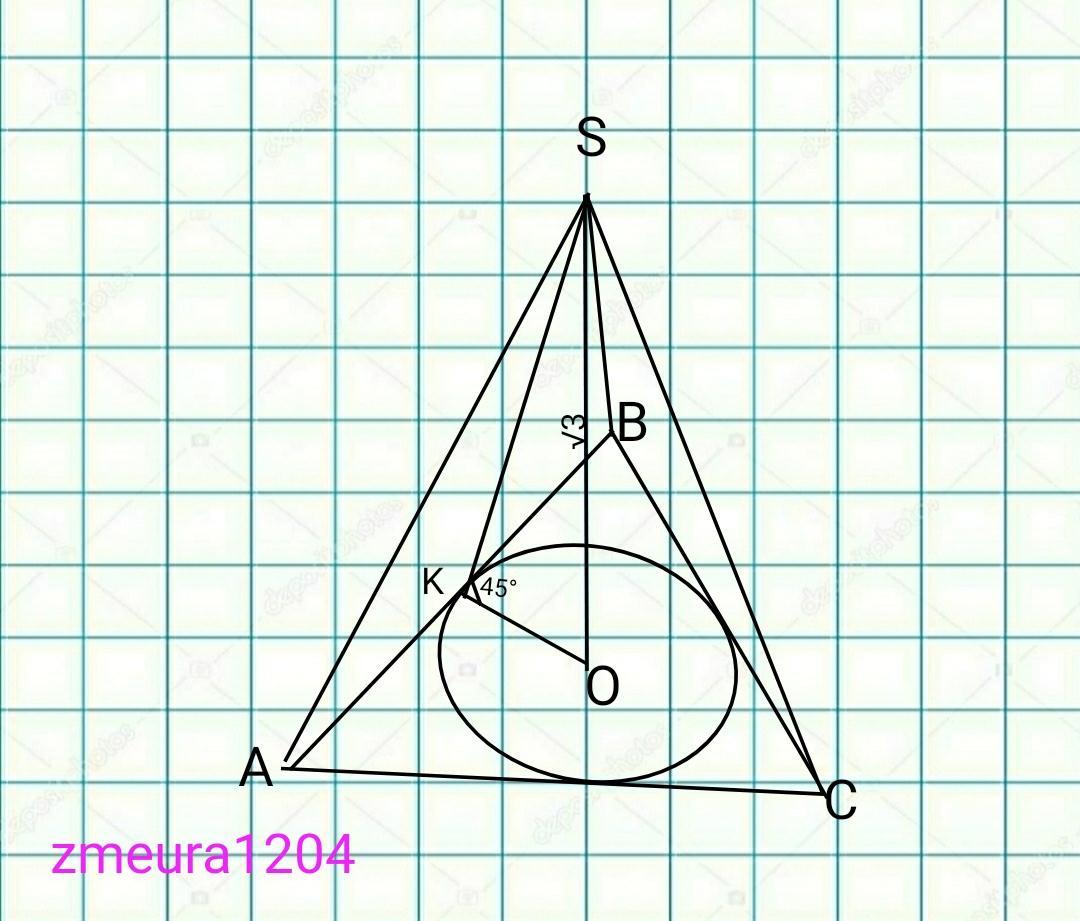 ∆SKO- прямоугольный, равнобедренный треугольник. (<SOK=90°; <SKO=45°; <KSO=180°-<SOK-<SKO=180°-90°-45°=45°), углы при основании равны 45°.