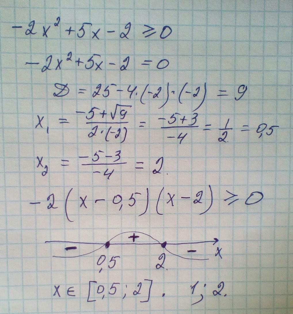 Множиною розв'язків буде проміжок, на якому функція набуває невід'ємних значень. Тобто x ∈ [0,5; 2]. Йому належать лише два цілих числа: 1 та 2.
