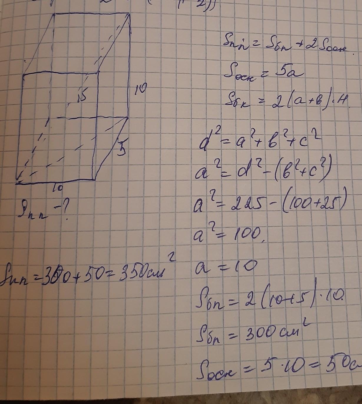 Два ребра прямоугольного параллелепипеда, выходящие из одной точки равны 10 и 5. Диагональ параллелепипеда равна 15. Найдите площадь полной поверхности параллелепипеда