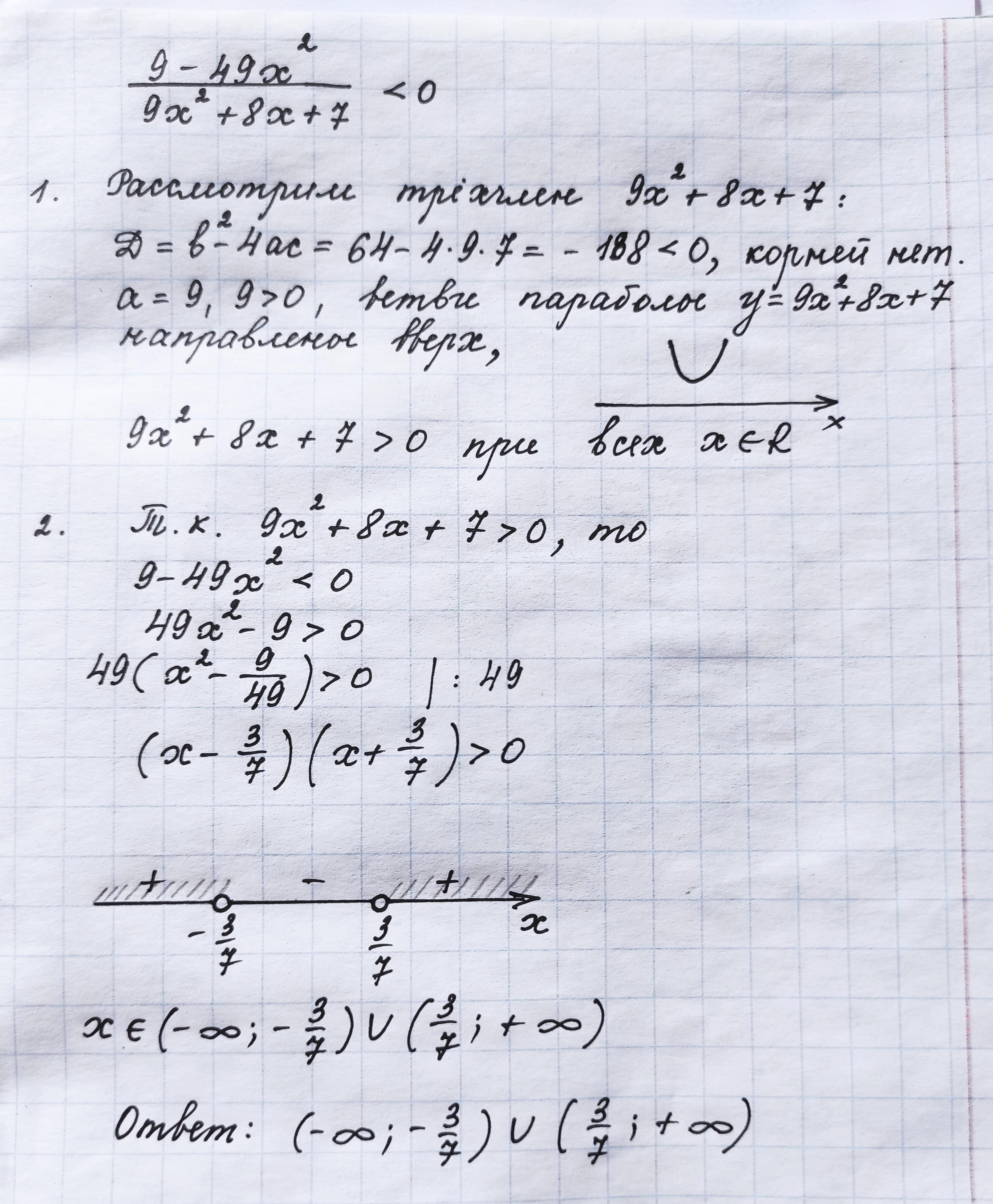 (9-49·0²)/(9·0²+8·0+7)=9/7; 9/7>0 ⇒ в самом интервале ставим знак минус.