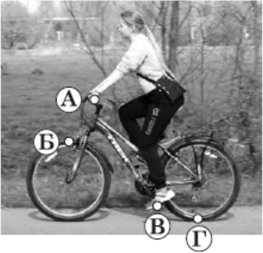 №7. Девочка едет на велосипеде прямолинейно горизонтальной дорогой. Определите, какая из точек велосипеда А – Г (см. фото) в данный момент времени имеет наибольшую скорость относительно дороги. (2-е фото)